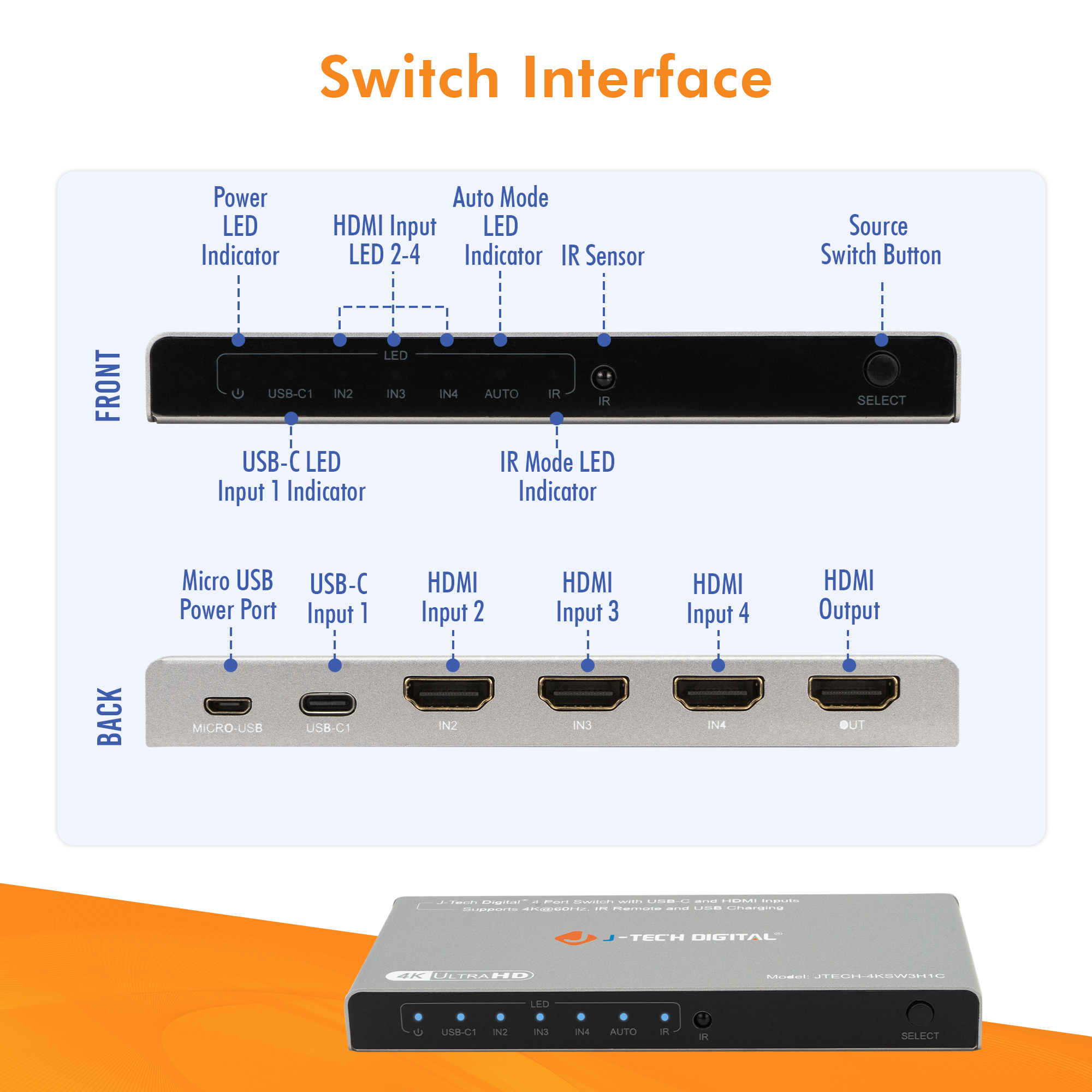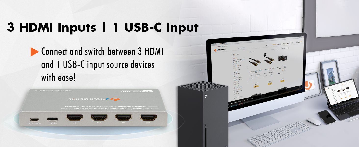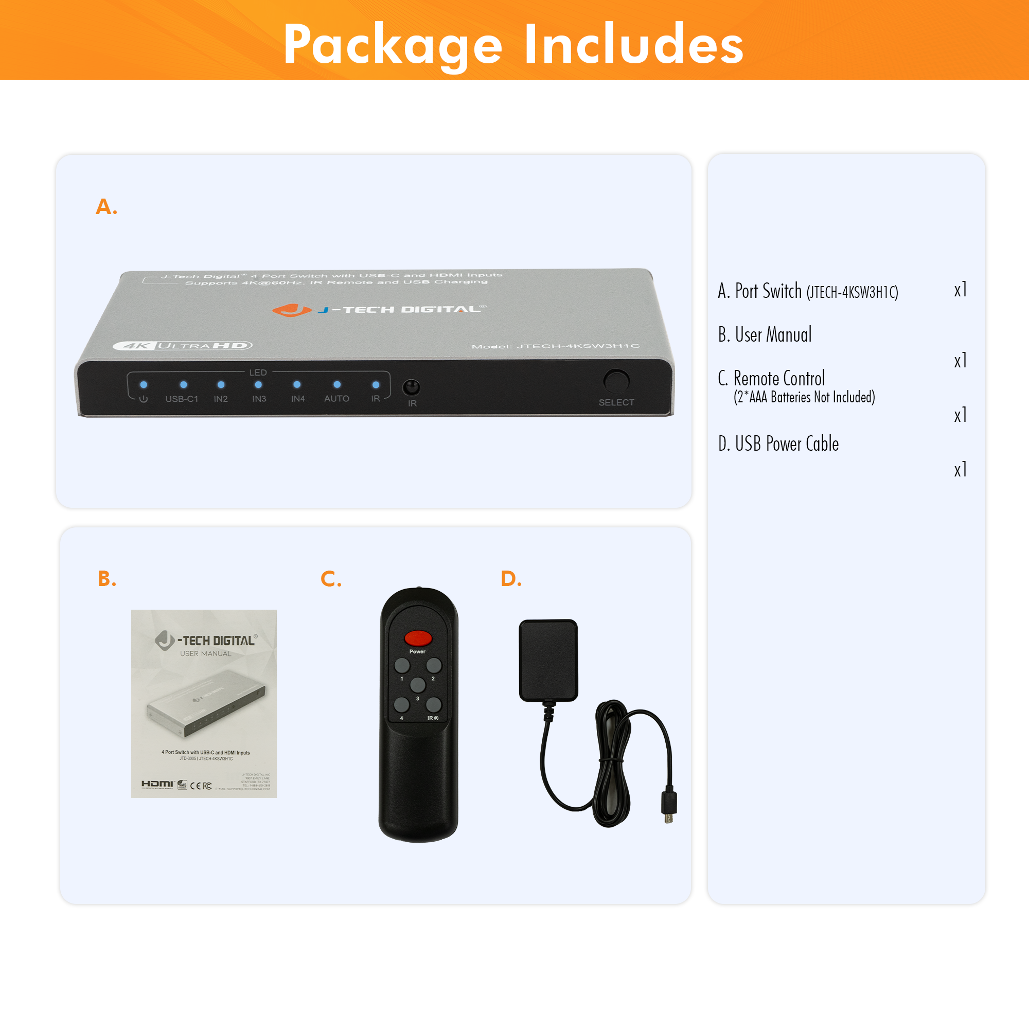 The JTECH-4KSW3H1C is a 4x1 switch that features 3 x HDMI inputs & 1 x USB-C input that can be connected to a single display. It supports resolutions up to 4K 60Hz 4:4:4, so that you can enjoy your content in vivid details. The dual switching modes provides you with the ability to either automatically or manually switch between your connected input source devices. Don’t let your setup become limited because of the available number of HDMI ports on your display. The JTECH-4KSW3H1C provides you with extra ports so that you can connect all of your favorite devices to your existing display and easily toggle through them to use the one you would like! Support for HDR/Dolby Vision and digital audio formats is also available. Install this unit in your setup today and feel the ease of use without any compromise.