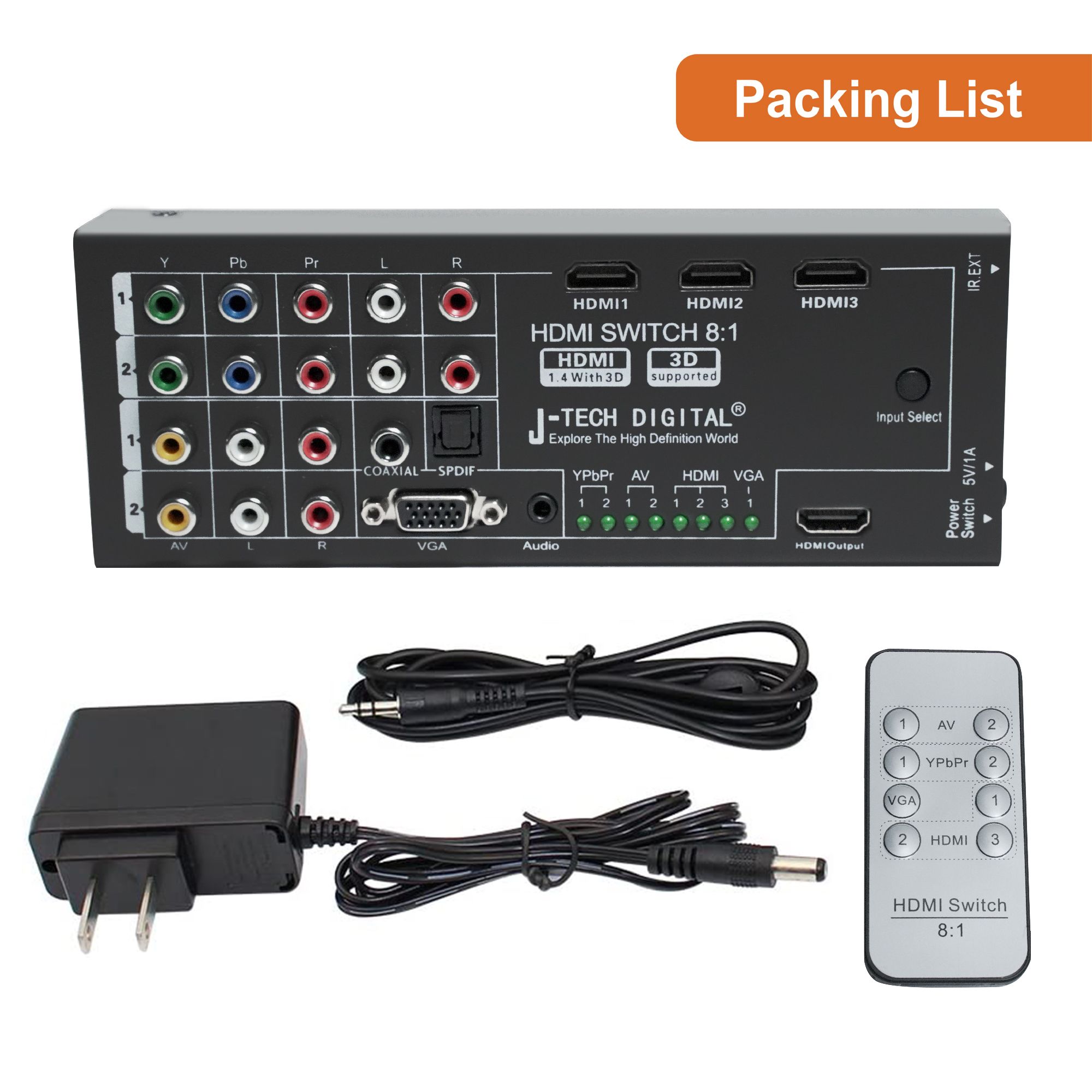 ✅ Inputs contain 2x YPbPR / Component Video, 2x AV, 1x VGA+3.5mm audio, and 3x HDMI; outputs contain 1 HDMI output, 1 optical and 1 coaxial audio output;