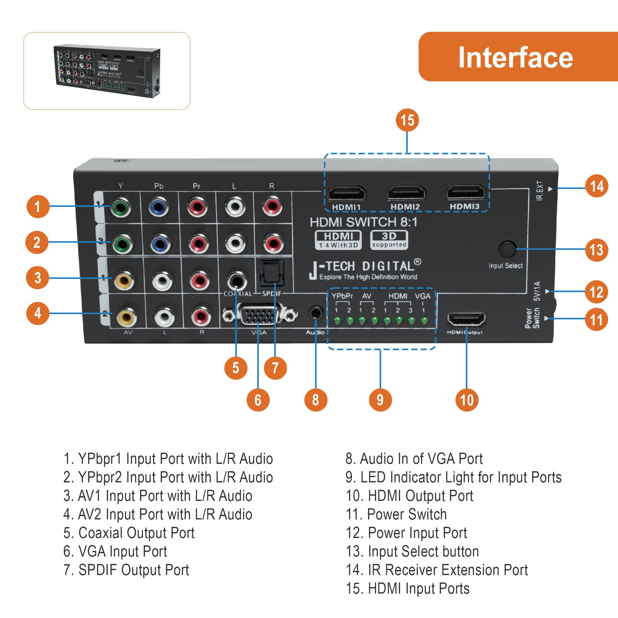 ✅ 8-inputs-1 output multi-function video/audio switch;
