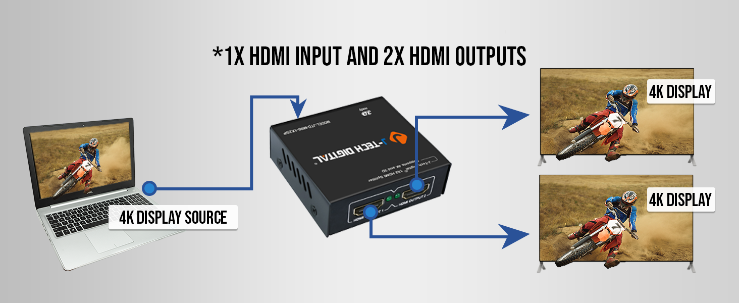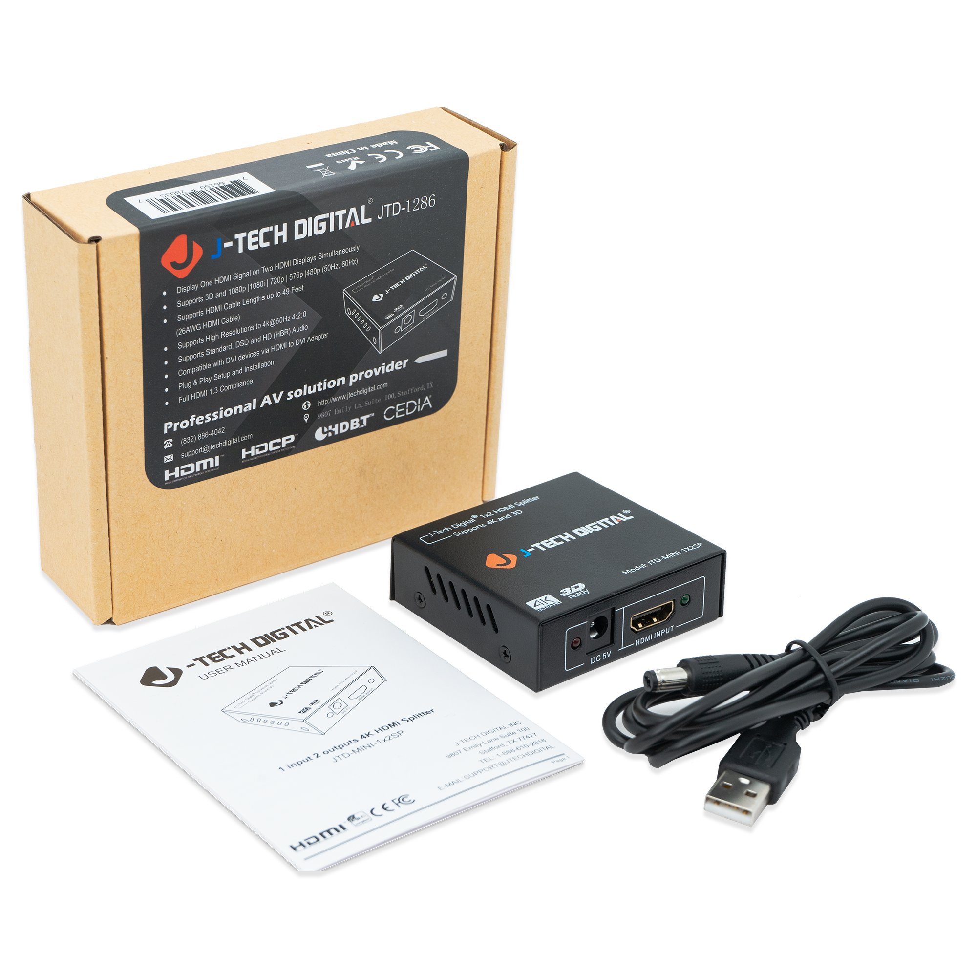 J-Tech Digital's JTD-MINI-1x2SP 4K splitter allows you to take an audio/video signal from 1 source device, and distribute that to 2 displays. Supports up to 4K 60Hz 4:2:0 resolution, and backwards compatible with 1080P, 720P etc. Perfect for using with Blu-Ray players, Gaming Consoles, Desktop and Laptops. Easily integrate this unit within your setup whether it's a residential or commercial environment.