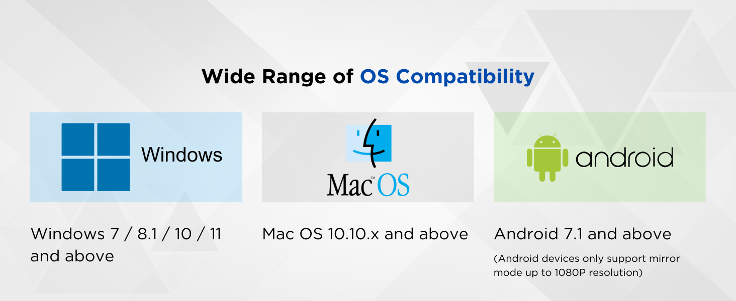 Works with Windows 7/8/8.1/10 and above, Mac OS 10.10.x and above, Android 7.1 and above