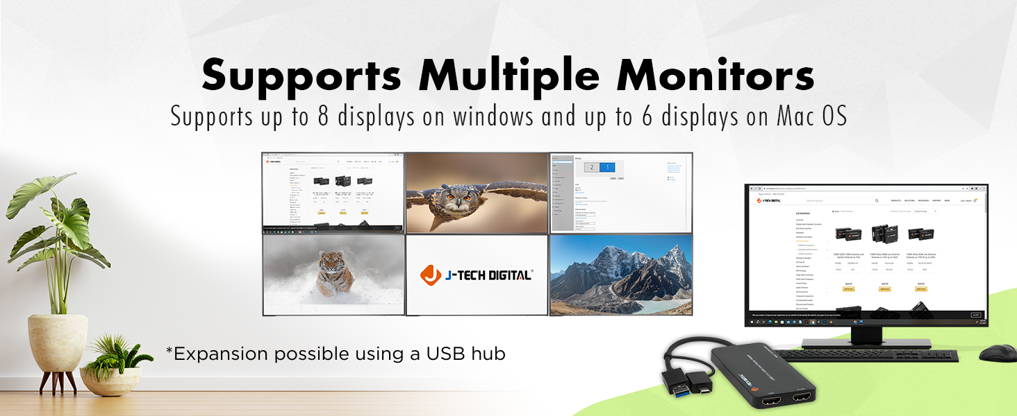 Extend up to 8 displays on Windows and 6 displays on Mac OS using a USB hub