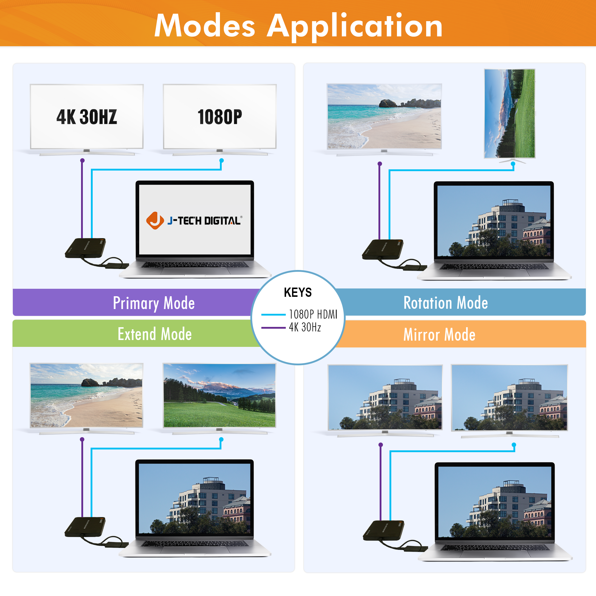 • ✅ Different Display Modes: Supports mirror, extend, rotation, and clamshell display modes. Note: Mac-based devices do not support rotation mode. M1/M2 Mac supports clamshell mode, while Intel Mac does not. Does not support playback of HDCP-protected content.