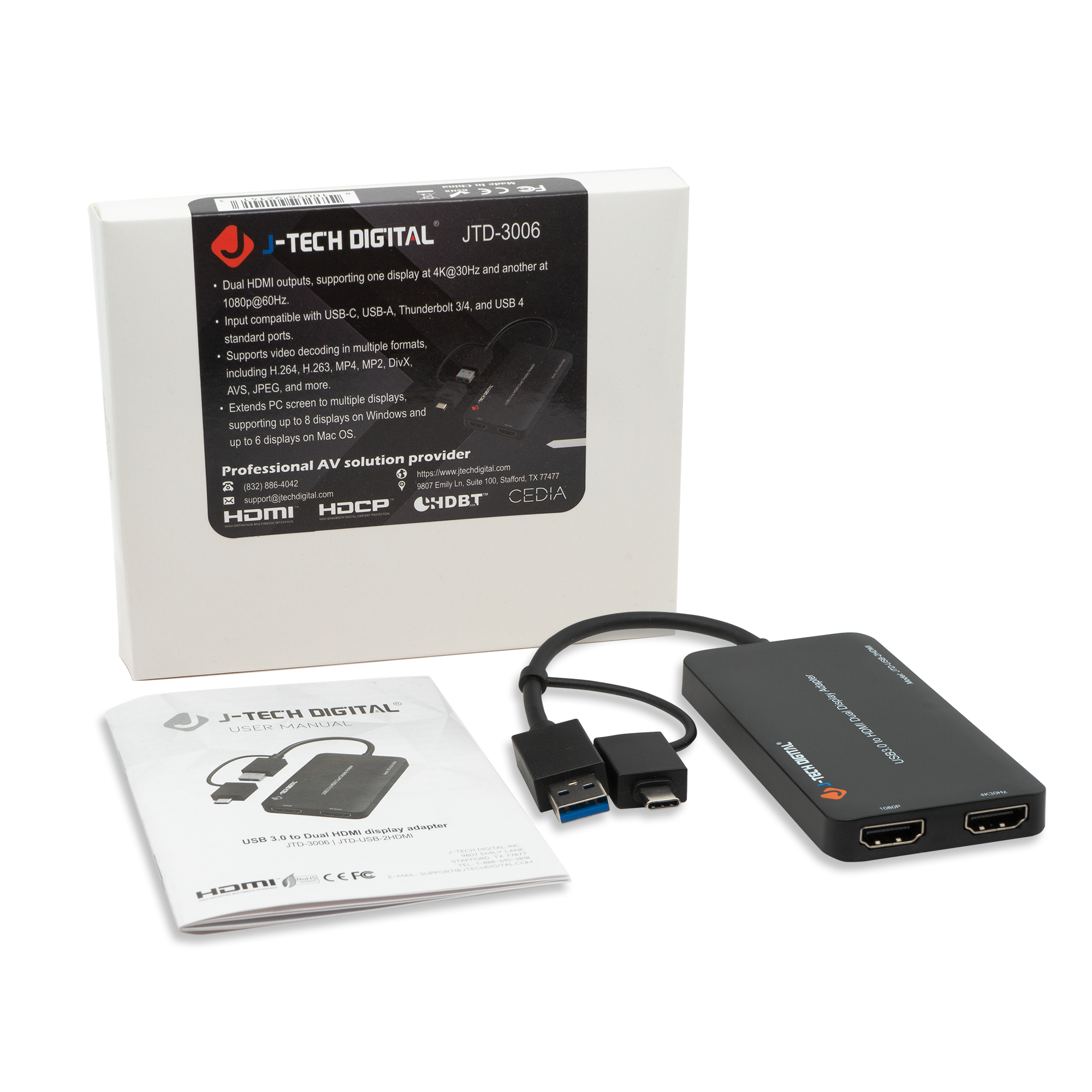 The JTD-USB-2HDMI adapter allows you to easily extend your desktop to multiple displays using a single USB 3.0 Type A or C input port. Featuring 2 HDMI outputs, the adapter supports dual resolution with 1 HDMI port supporting up to 4K 30Hz and the other at 1080P 60Hz. Extend up to 8 displays on Windows and 6 displays on Mac OS. The JTD-USB-2HDMI is powered by either the USB-A or USB-C ports, eliminating the need for an external power adapter. It is compatible with USB-C, USB-A, Thunderbolt 3/4, and USB 4 standard ports, and can decode multiple video formats such as H.264, H.263, MP4, MP2, DivX, AVS, JPEG, and more. Providing a plug & play function, easily integrate the JTD-USB-2HDMI adapter within your setup today, and enjoy the convenience of multiple displays today!