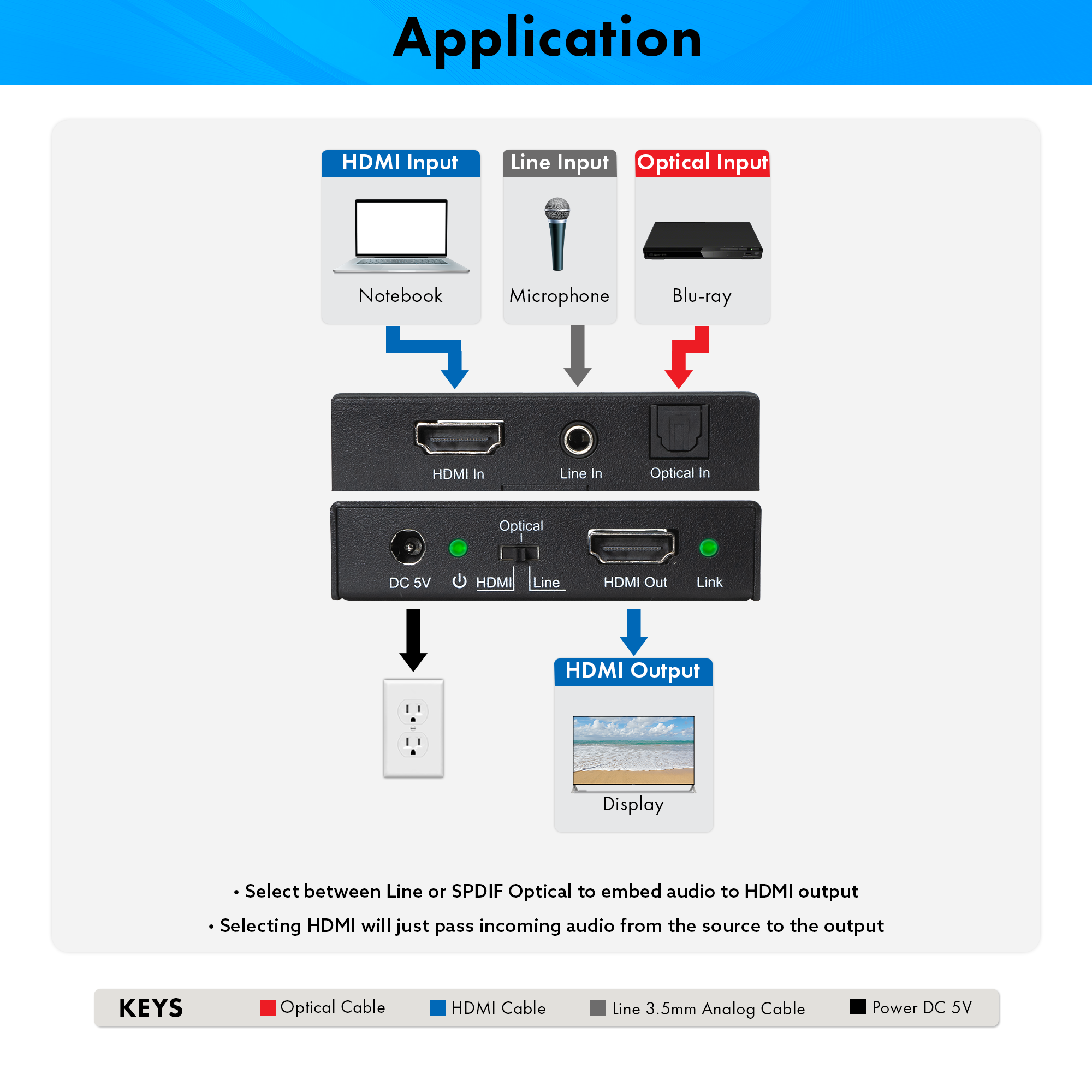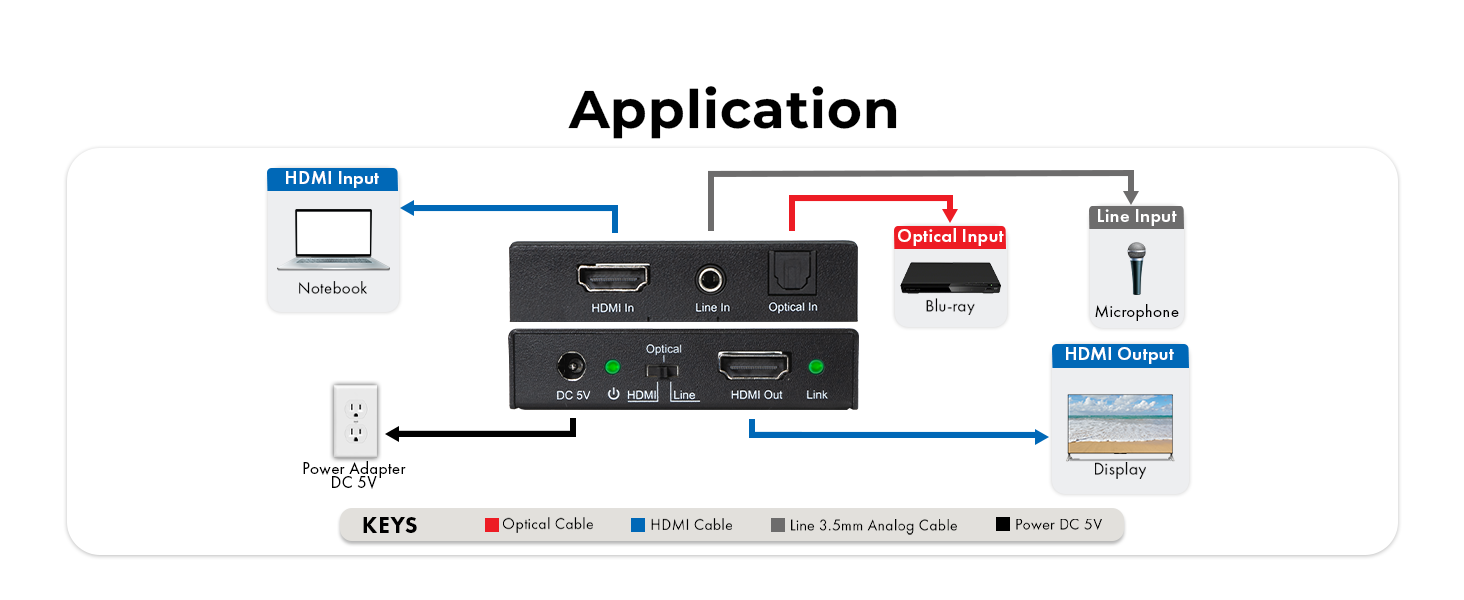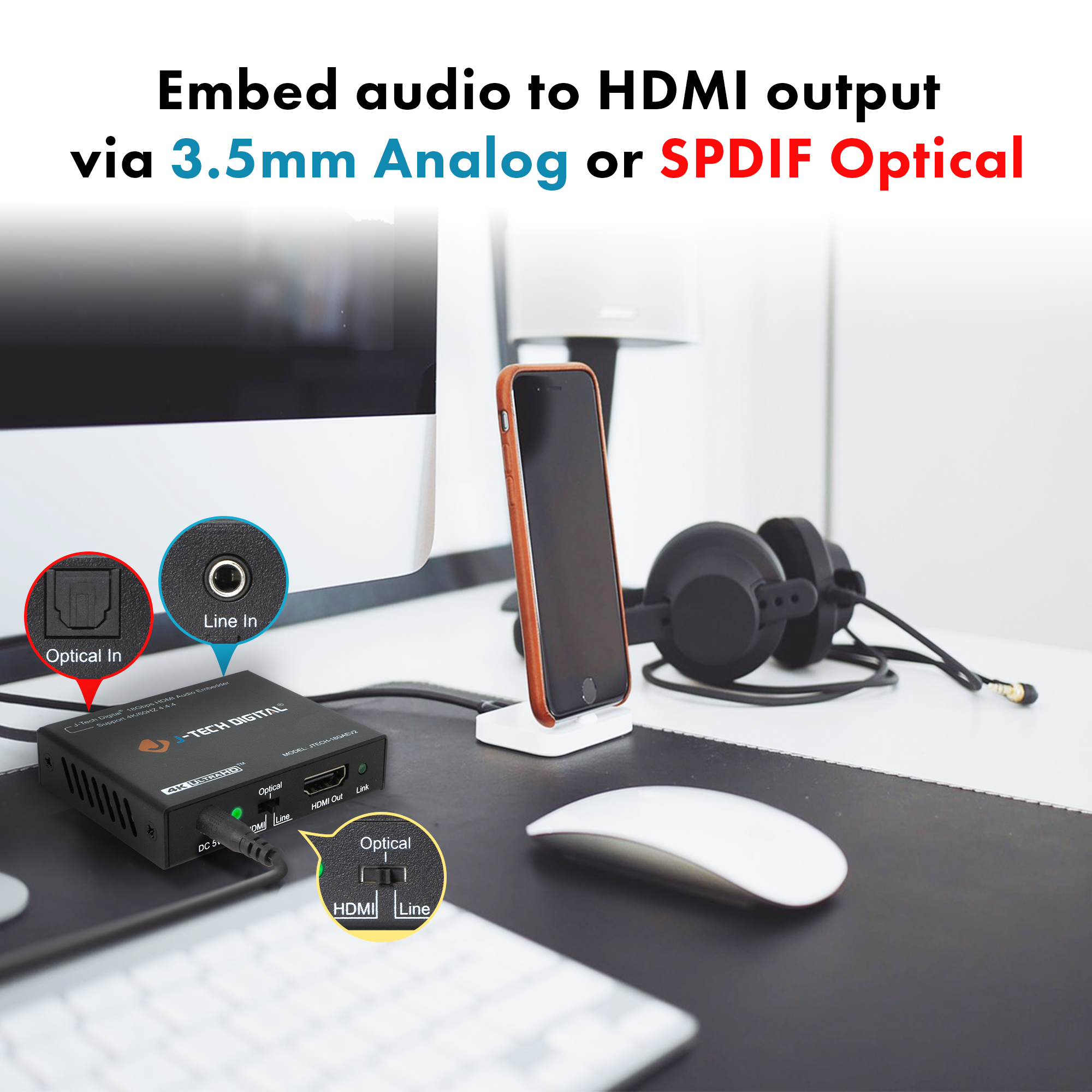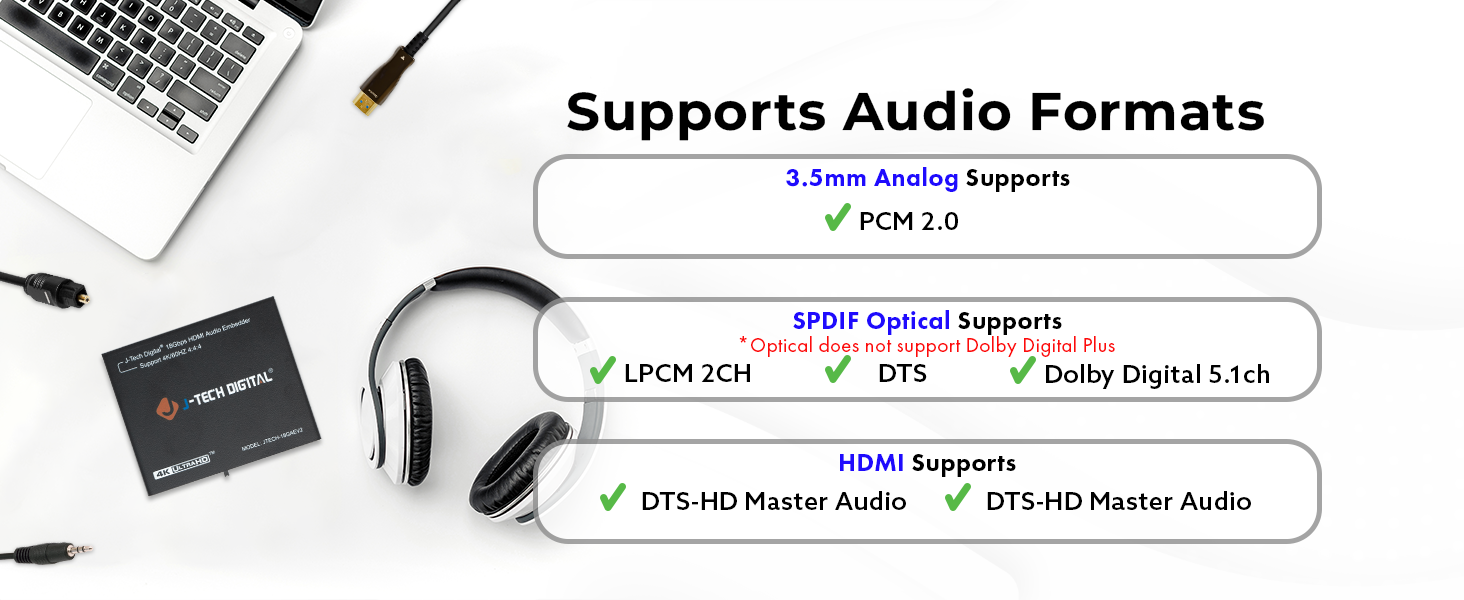 ✅ Embed audio to the HDMI output via 3.5mm/line or SPDIF Optical