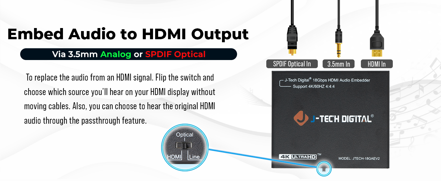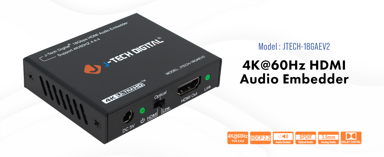 Do you need to merge separate audio and video sources into a single HDMI signal? Whether you're creating video tutorials or revisiting live stream gaming, the JTECH-18GAEV2 is your solution! This device can embed HDMI video (up to 4K@60Hz 4:4:4) along with either multi-channel digital optical audio (TOSLINK/SPDIF) or analog audio (3.5mm/line) into one HDMI output. You also have the flexibility to retain the original HDMI audio instead of replacing it. This feature allows for more options without the hassle of swapping cables; simply flip a switch. Now, instead of just sharing video content, you can ensure your audience hears your commentary as they watch.