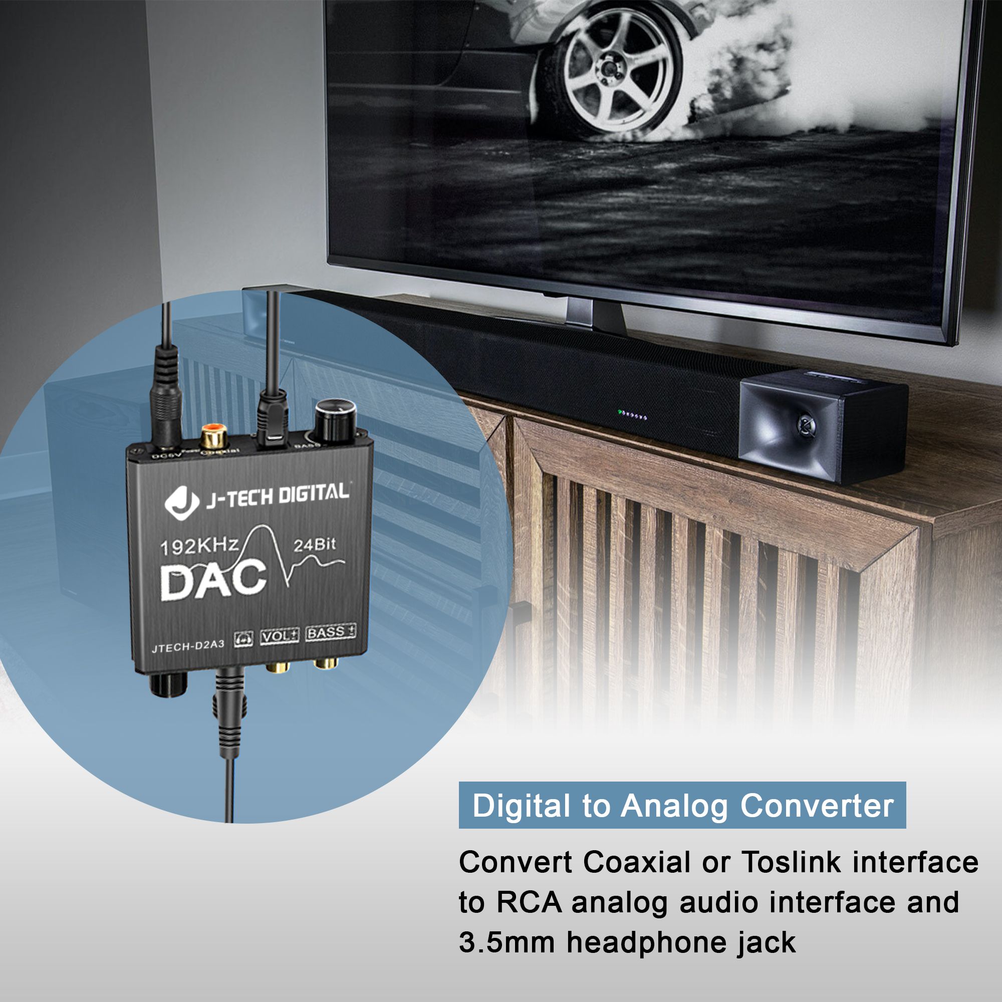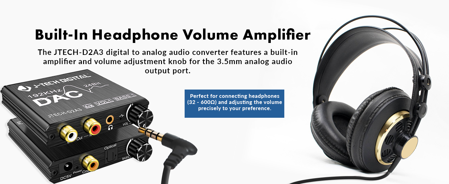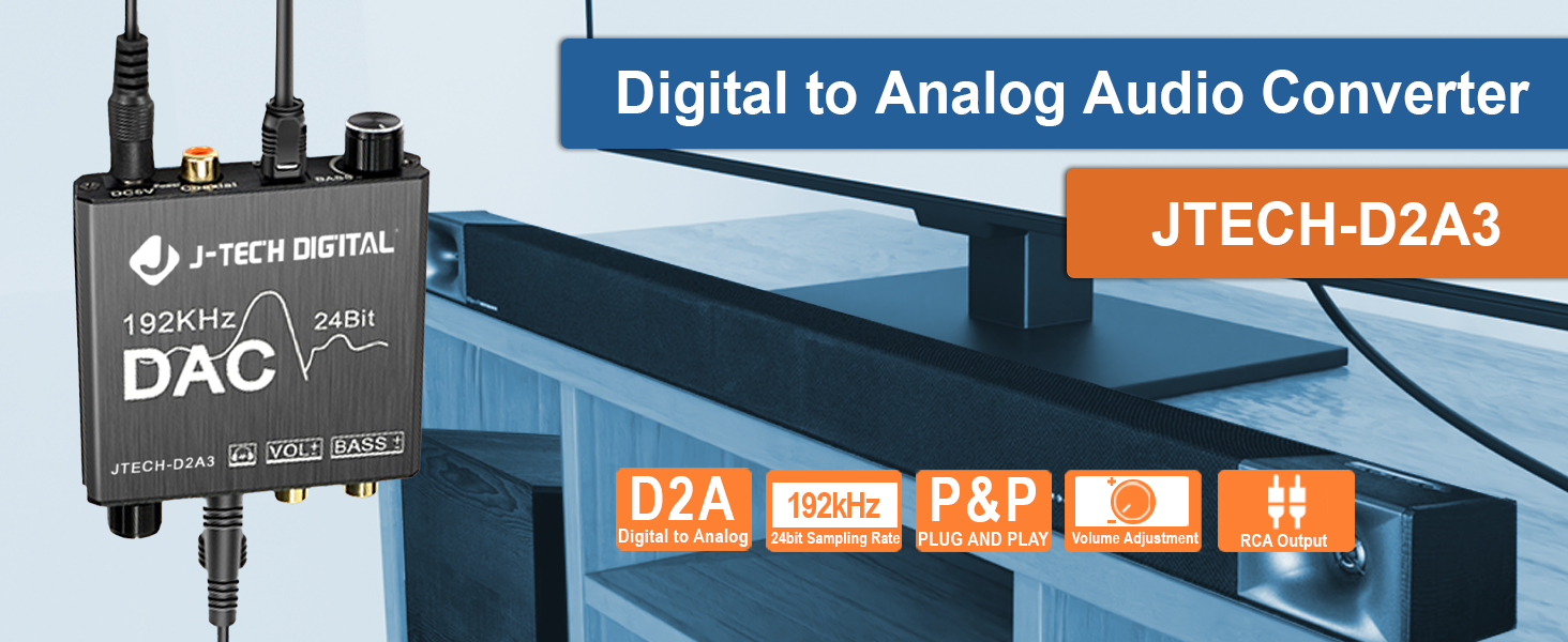 The JTECH-D2A3 digital audio to analog converter features both optical and coaxial digital audio input ports as well as RCA and 3.5mm analog audio output ports for the ultimate in system flexibility.