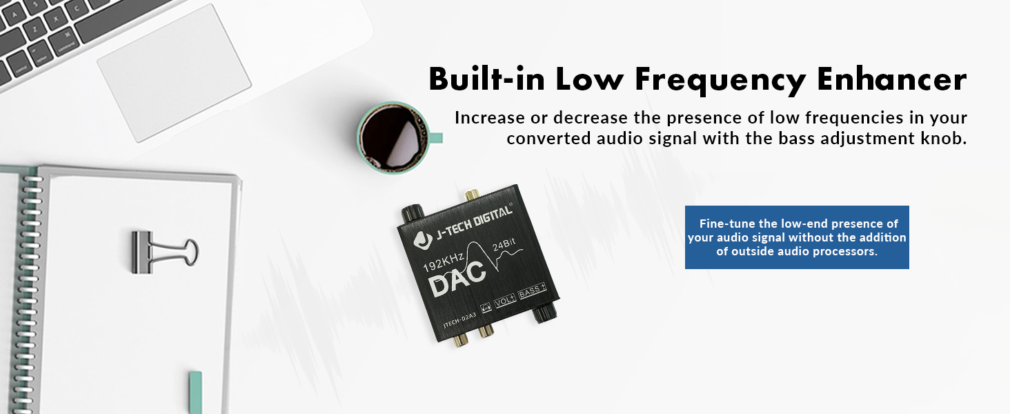 The J-Tech Digital JTECH-D2A3 digital to analog audio converter is the perfect device for integrating legacy AV equipment or headphones to your system. The JTECH-D2A3 supports 192kHz 24bit audio sampling for hi-fidelity audio to your analog audio components. Unlike most digital-to-analog signal converters, the JTECH-D2A3 features a volume amplifier and bass control function for ensuring your converted audio signal is ideal for your application.