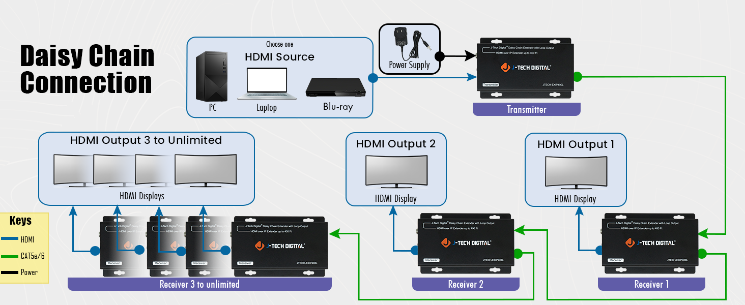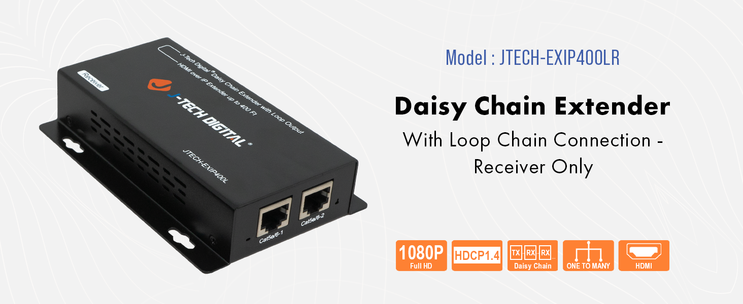 Users have the ability to daisy chain one receiver to another via Ethernet to share the source signal from the transmitter. Now, instead of running an additional Ethernet cable back to your equipment rack for each receiver, users can simply make a much shorter Ethernet run from one receiver to another. This daisy chain method saves users on Ethernet cable costs, simplifies installation and reduces the number of break points in your AV over IP installation.