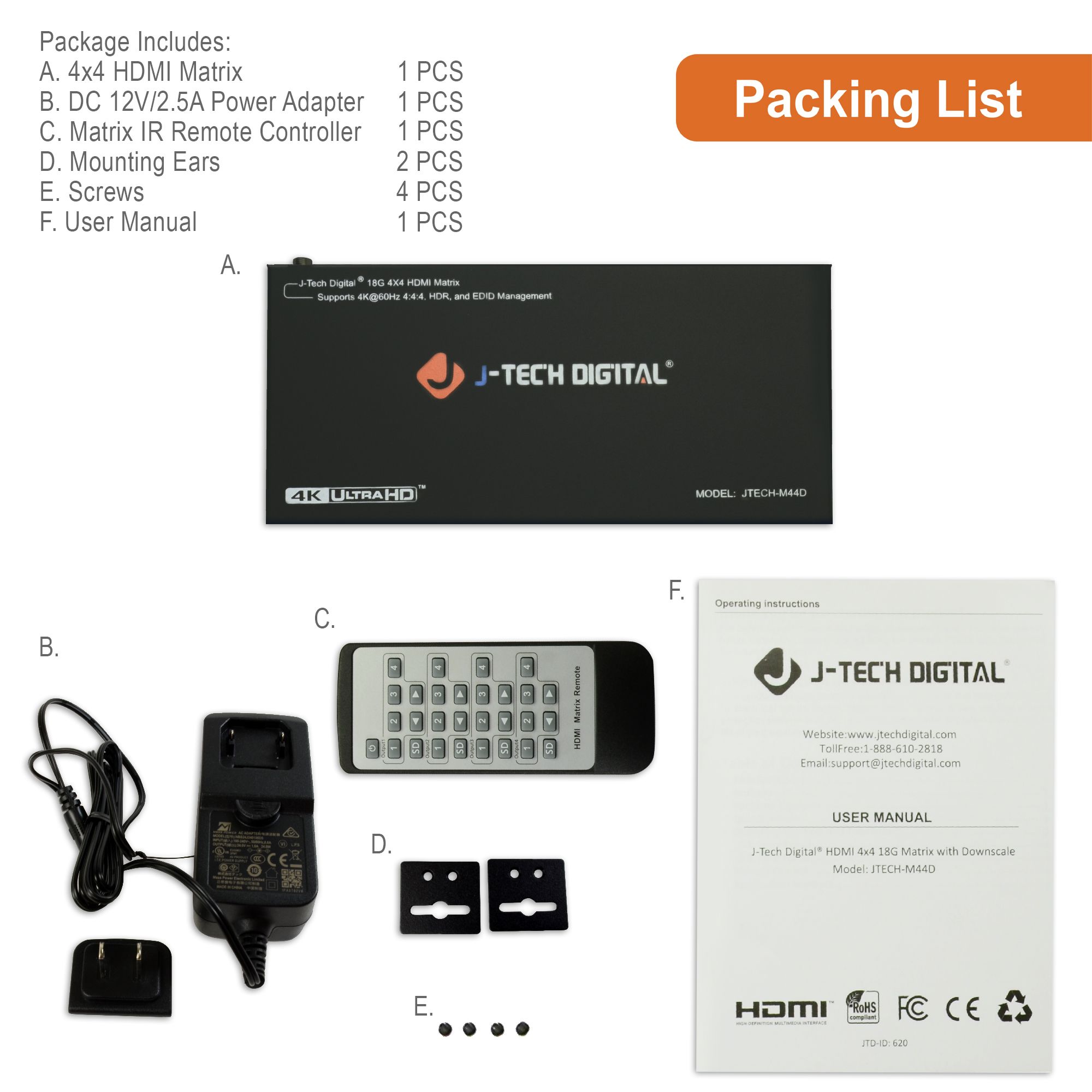 The J-Tech Digital JTECH-M44D is a professional UHD 4K@60Hz 4:4:4 HDR HDMI video distribution matrix. With 18Gbps HDMI 2.0 support, the JTECH-M44D 4×4 HDMI Matrix allows up to four UHD 4K sources to be independently routed to four UHD displays. Each output has the ability to downscale 4K content to connected 1080p displays without affecting the 4K source or other 4K displays. Pair the 4K downscaler with the JTECH-M44D ‘s EDID management tool (built in EDID + EDID copy) and you have an incredibly versatile and flexible HDMI routing system suitable for a number of applications.