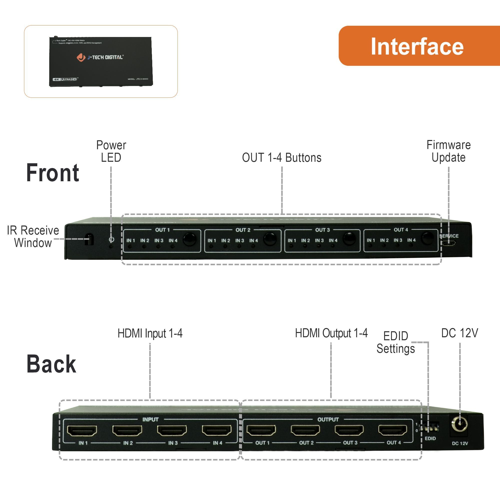 Optimize your AV setup with the J-Tech Digital 4x4 HDMI matrix, supporting 4K 60Hz, HDR, and 1080p downscaling for seamless HDMI signal distribution.