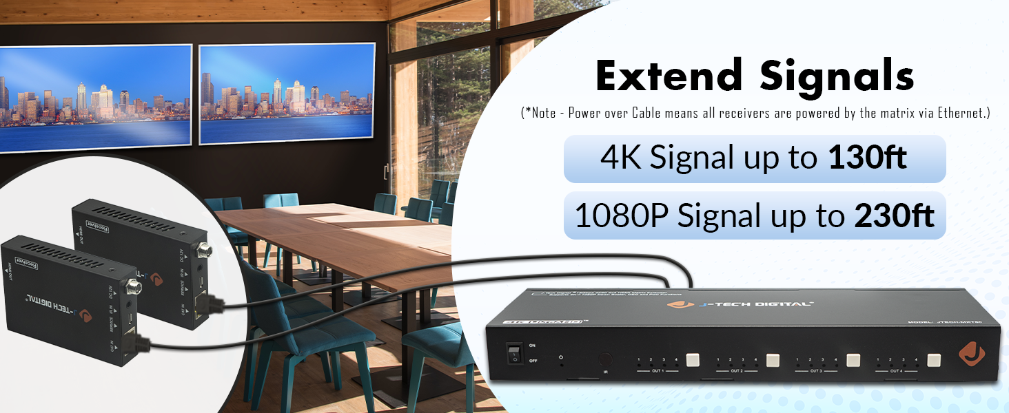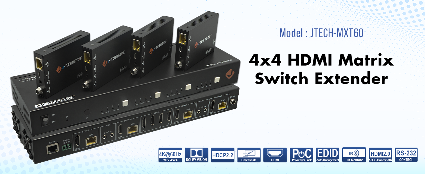 The J-Tech Digital JTECH-MXT60 is a professional 4x4 HDMI 2.0 matrix extender solution for many different applications and industries where it is necessary to route multiple UHD source signals to multiple displays in different locations within your environment. Users can transmit a 4K 60Hz HDMI source signal up to 130 FT away via single Cat5e/6 ethernet runs to included MXT60 CAT receivers.