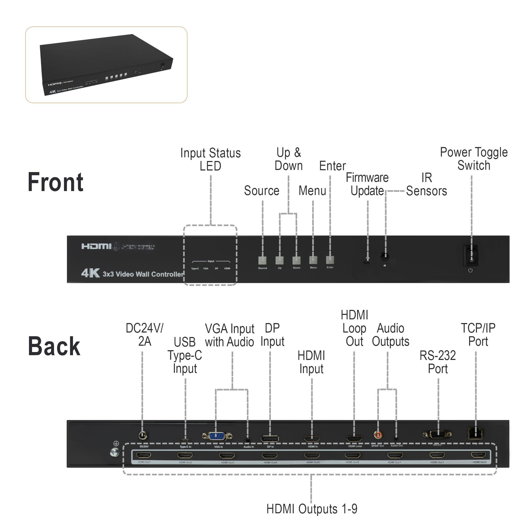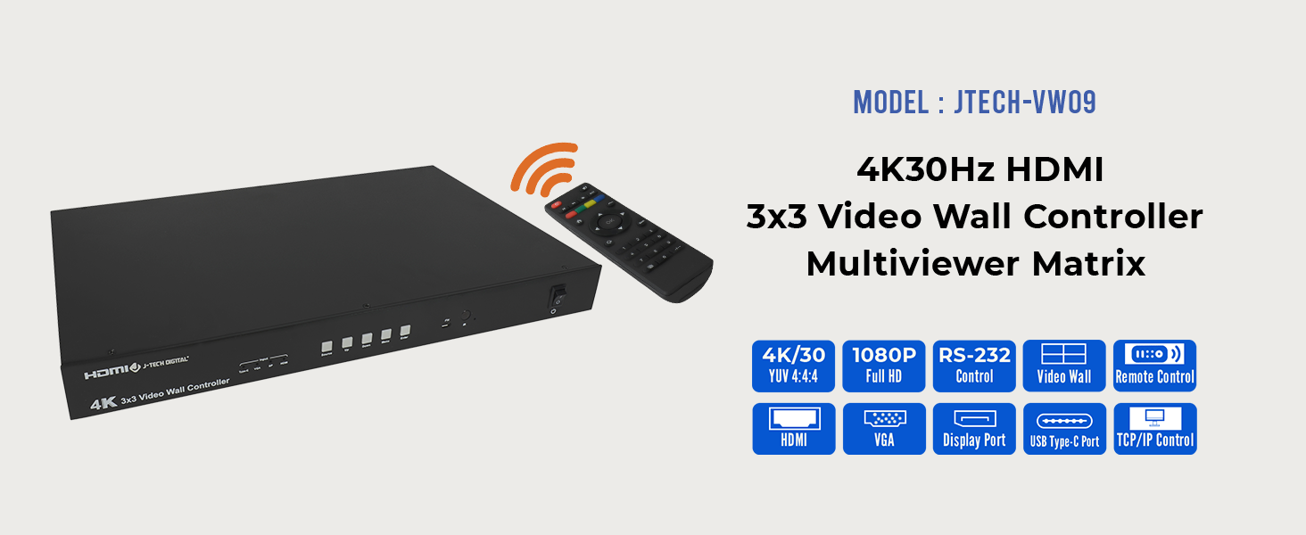 The J-Tech Digital JTECH-VW09 4K30Hz 3×3 video wall controller offers a unique and expandable video wall solution for nearly any application. The VW09 video wall controller supports USB Type-C (USB-C), VGA, Display Port and HDMI input source devices allowing it to be an incredibly flexible content sharing solution for a variety of applications including conference rooms and learning centers.