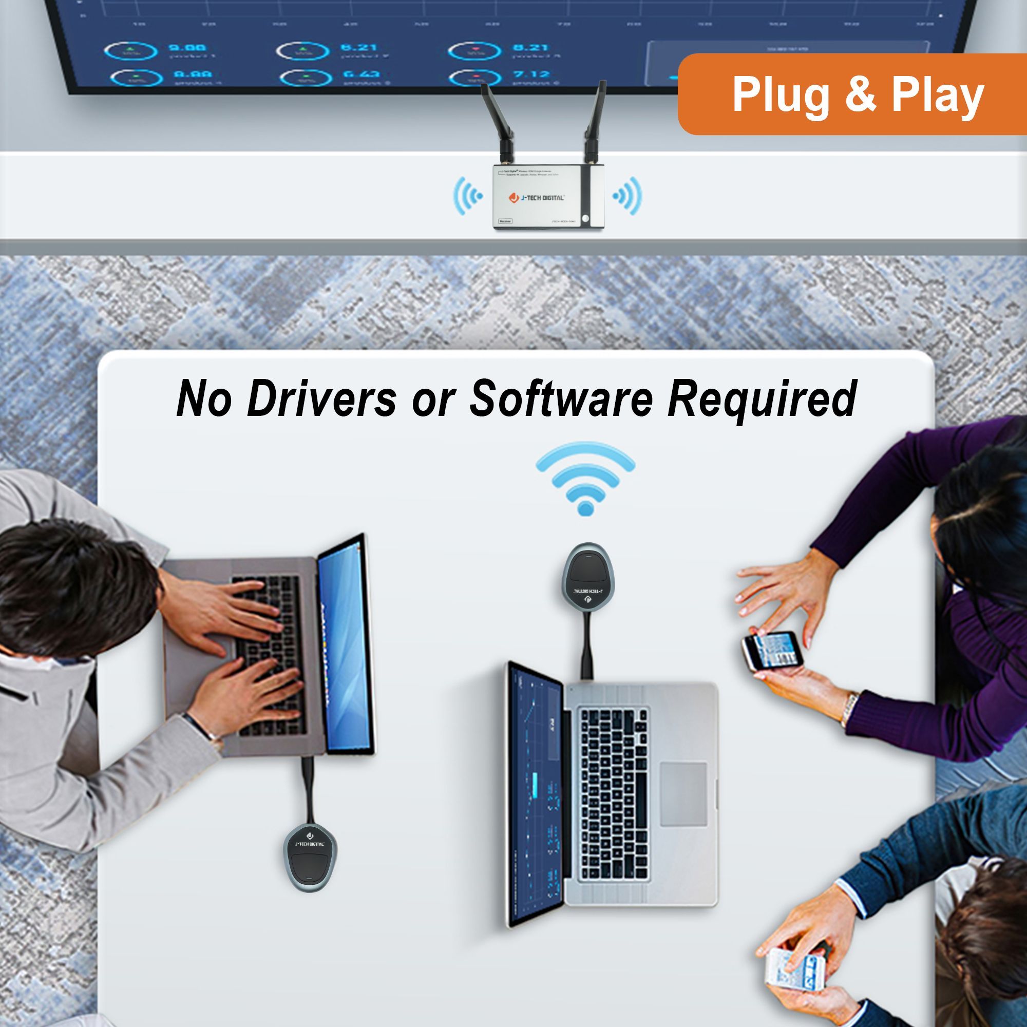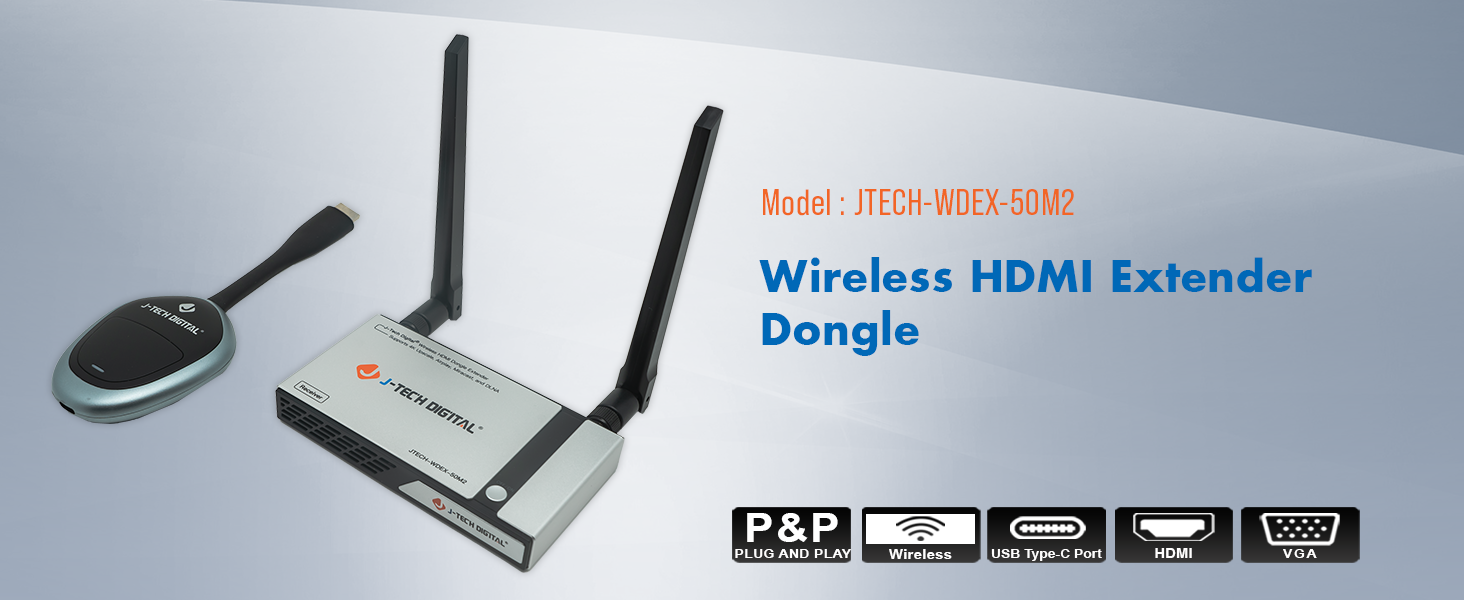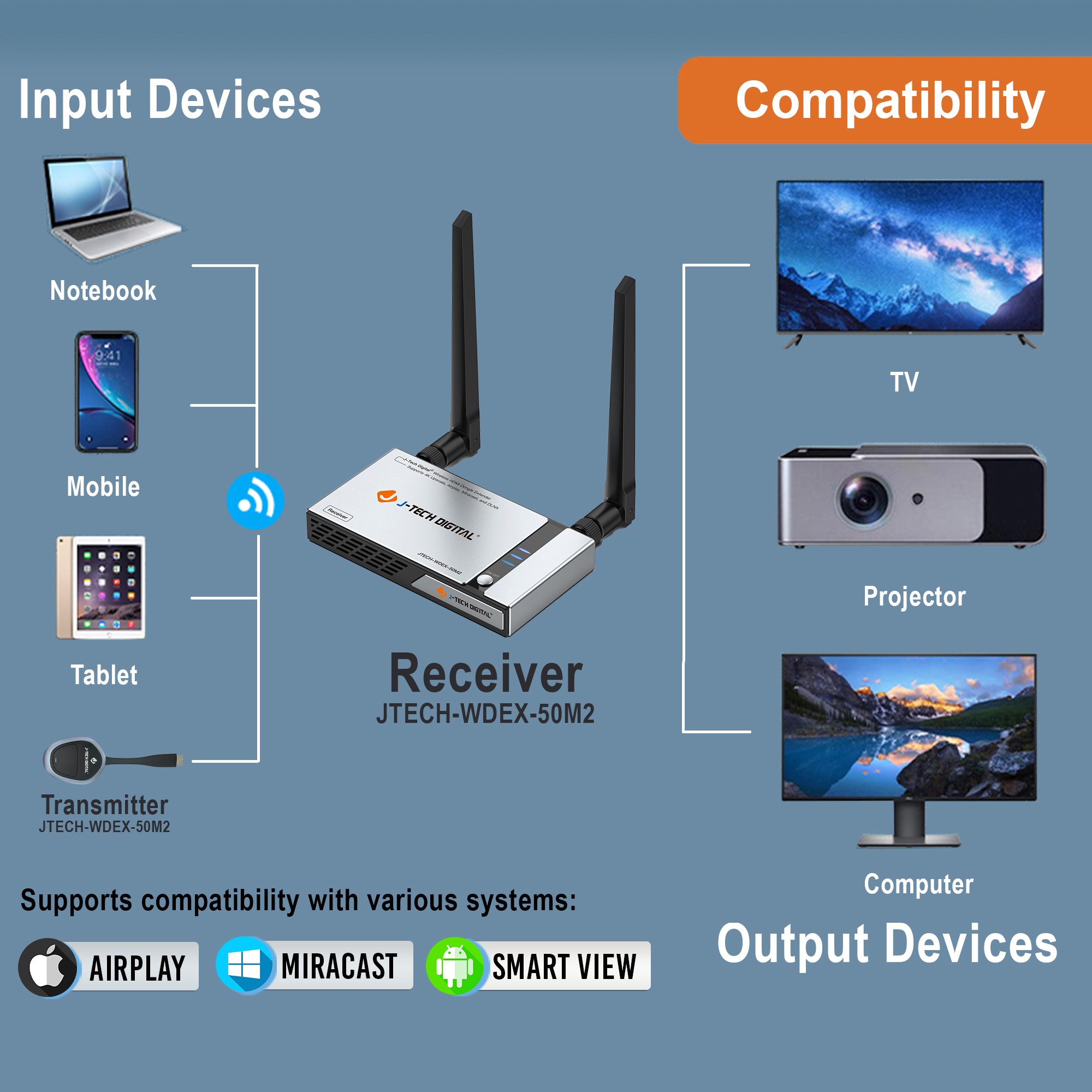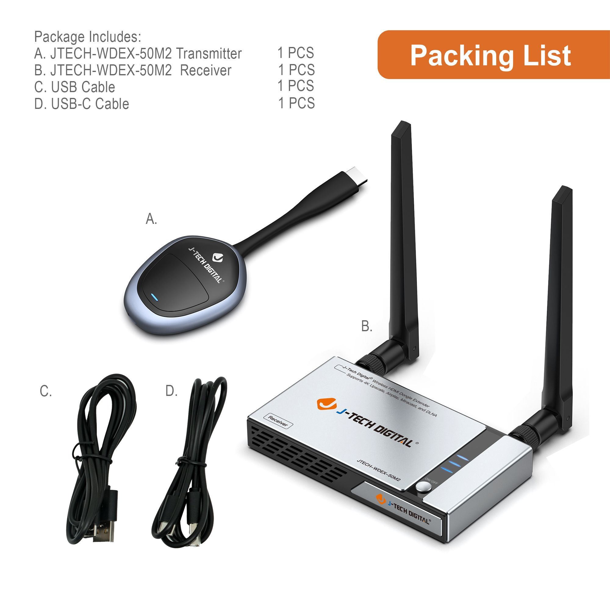 The J-Tech Digital JTECH-WDEX-50M2 is an all-in-one casting and HDMI wireless presentation system. Use the JTECH-WDEX-50M2 HDMI transmitter to wirelessly transmit AV signal from HDMI source devices like Apple Macbook, Windows PCs, gaming consoles, and set top boxes. Perfect for conference rooms, classroom presentations, and even residential use when running long cables is not viable.