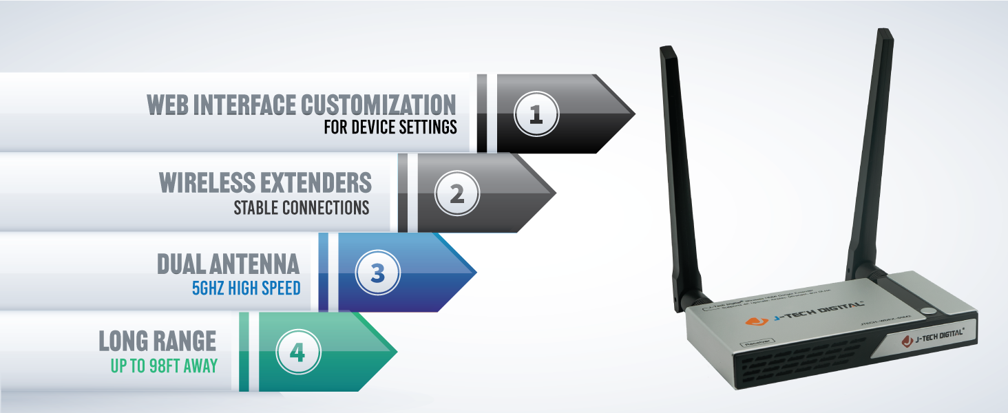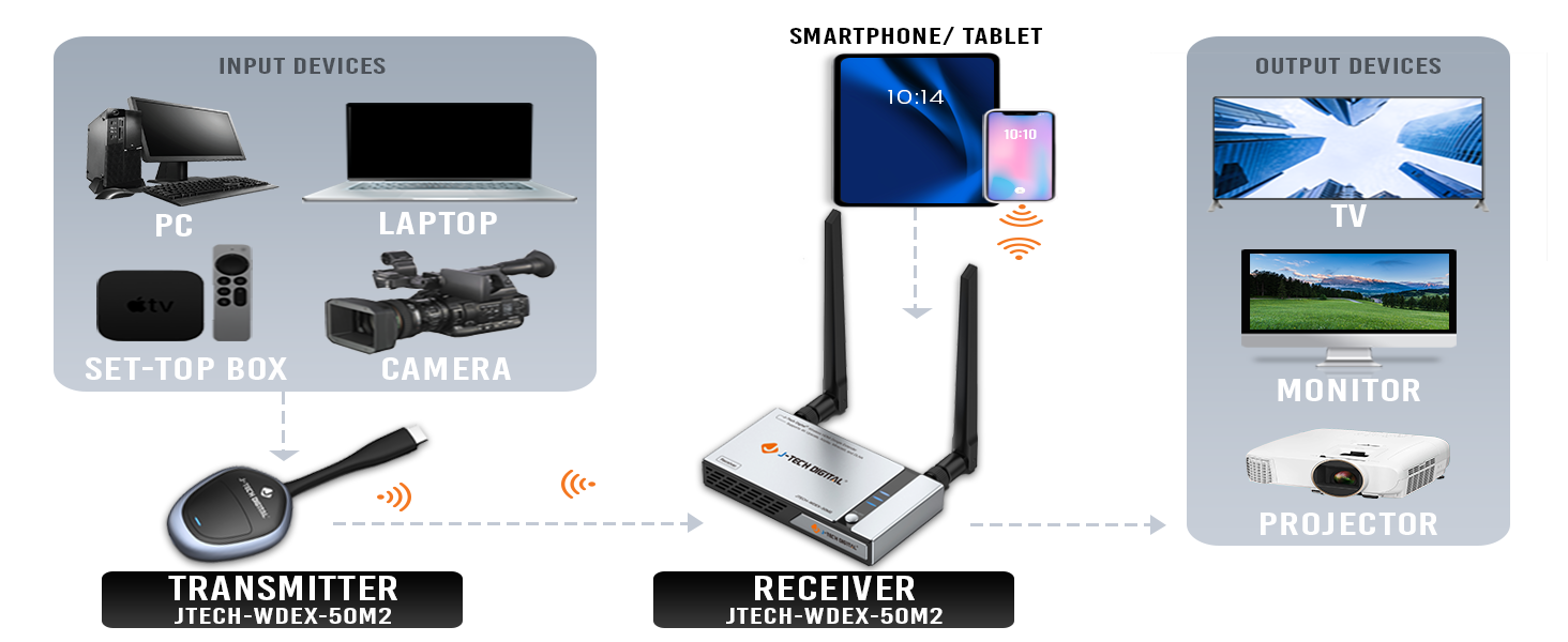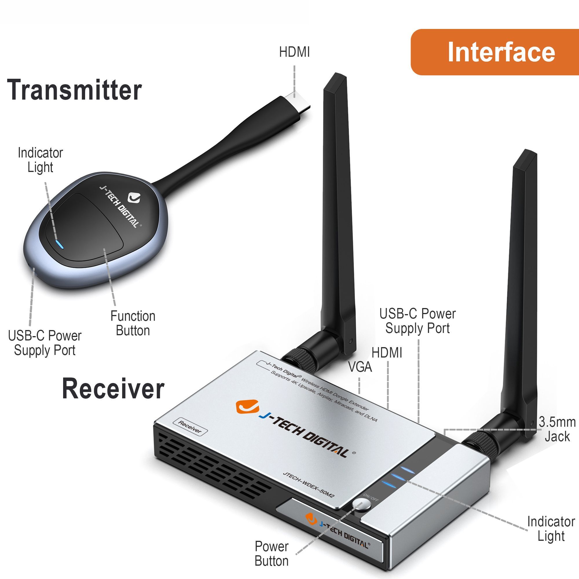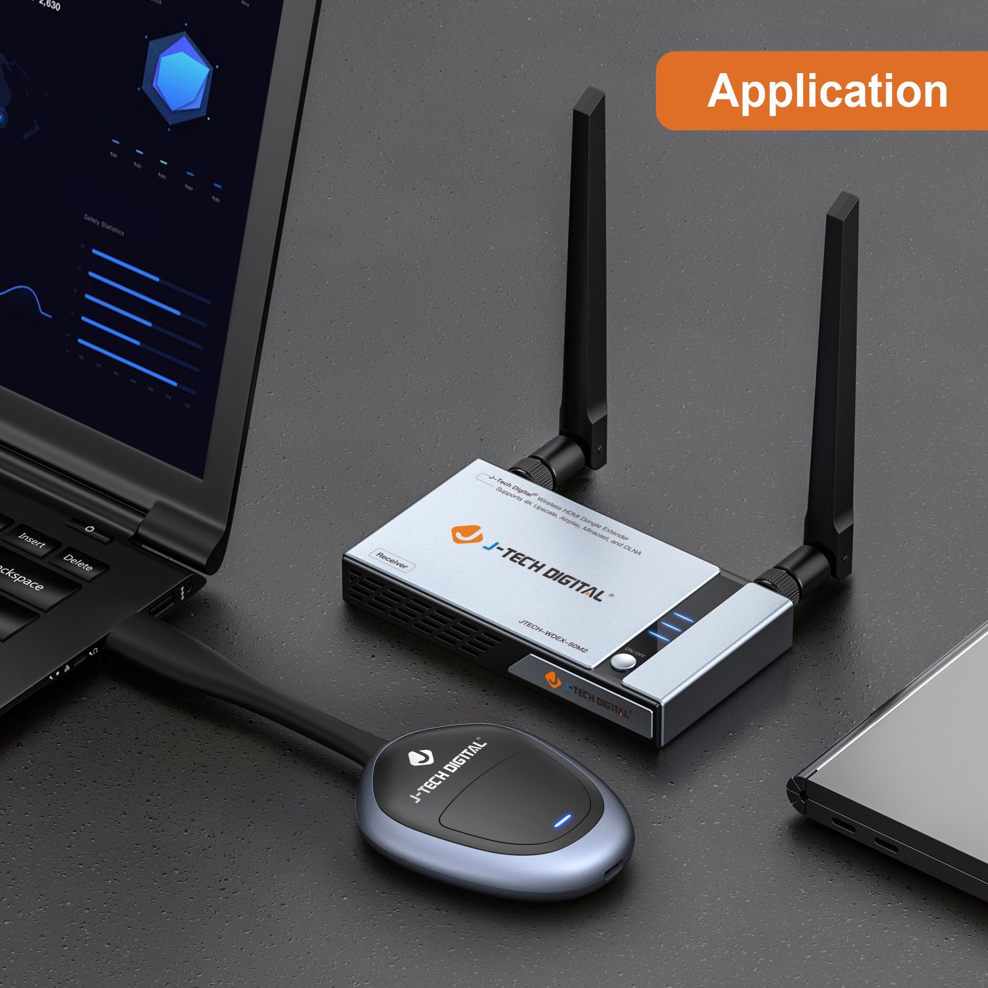 The J-Tech Digital JTECH-WDEX-50M2 is an all-in-one casting and HDMI wireless presentation system. Use the JTECH-WDEX-50M2 HDMI transmitter to wirelessly transmit AV signal from HDMI source devices like Apple Macbook, Windows PCs, gaming consoles, and set top boxes. Perfect for conference rooms, classroom presentations, and even residential use when running long cables is not viable.