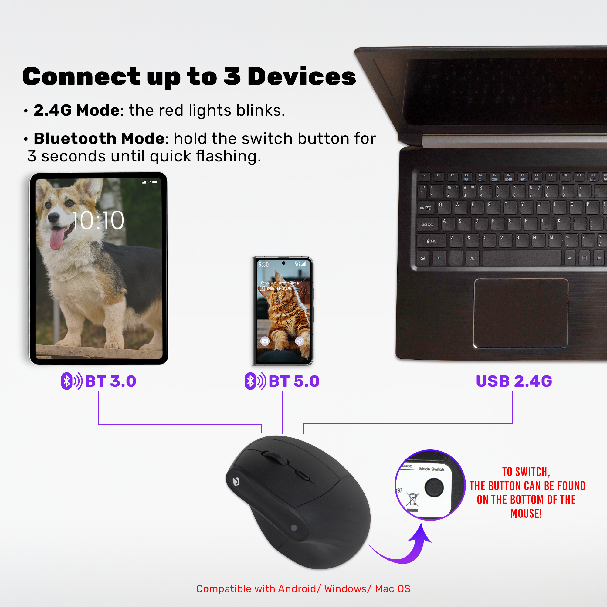 ✅ Works with 2.4G wireless and 3.0 / 5.0 Bluetooth modes. 3 multi-device functionality allows for connecting 3 devices and easy switching