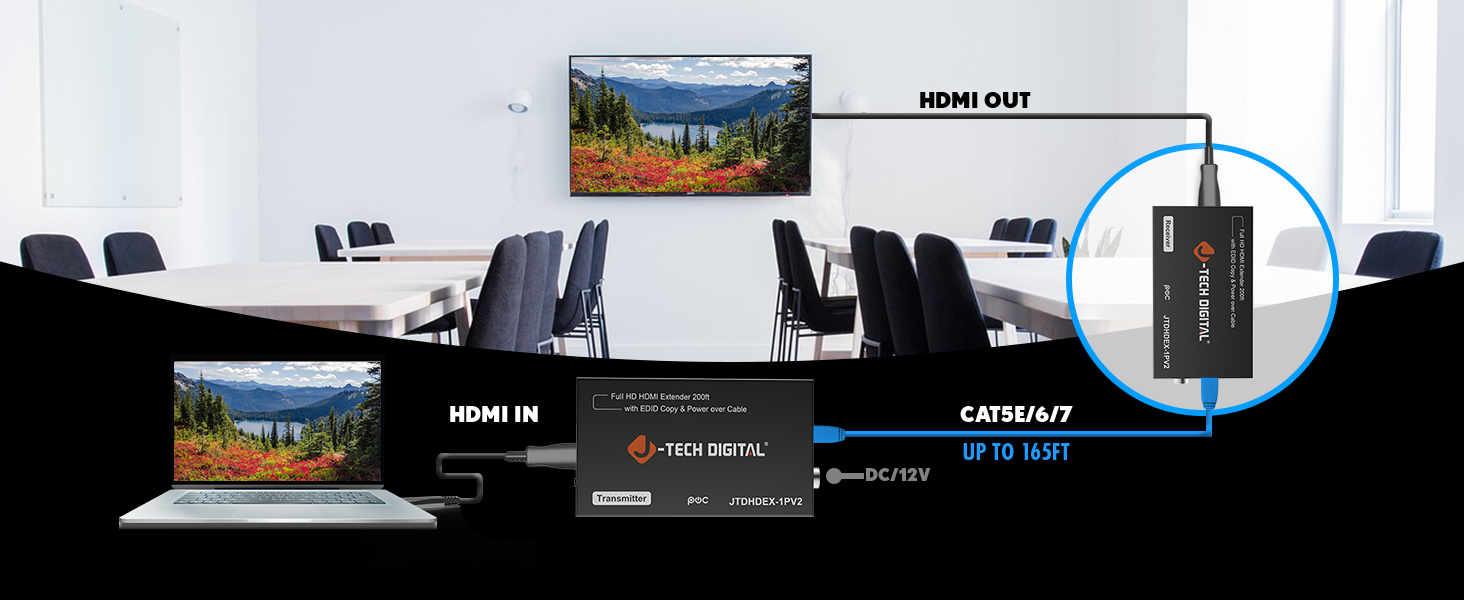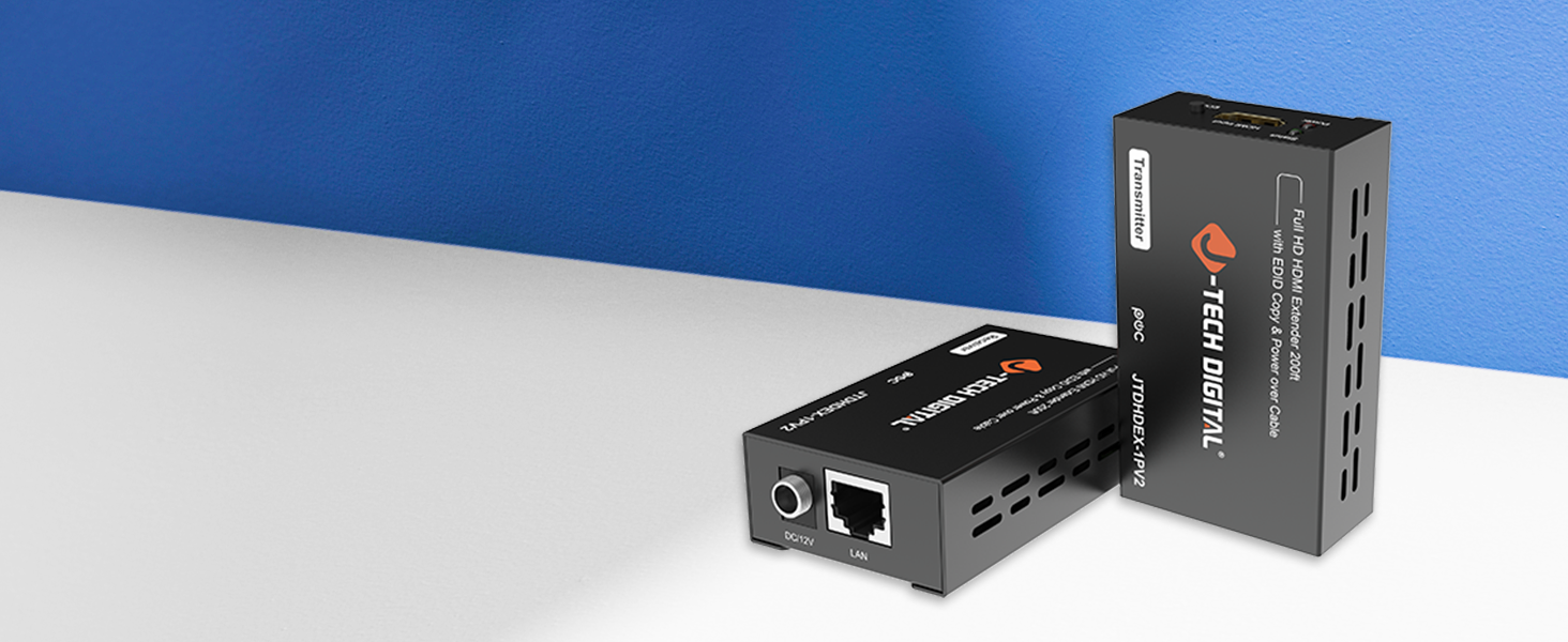 The JTD-HDEX-1PV2 HDMI over single ethernet extender is able to extend a 1080P audio/video signal up to 165ft. which is four times the transmission distance of a typical HDMI cable. The PoC (power over cable) function allows users to only use one power adapter between the transmitter and the receiver, making for a cleaner, clutter-free setup. This extender is viable in any installation, whether residential or commercial.
