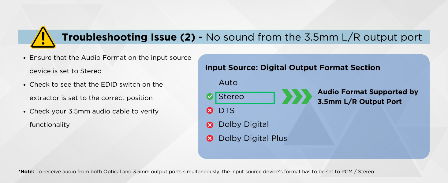 Please Note: If you are not able to get audio from either Optical or 3.5mm output ports, please check your input source audio settings and ensure that the audio output is set to either PCM (For 3.5mm output), or PCM, DTS, or Dolby Digital (For Optical output). If the input source device is outputting Dolby Digital+ (DD+) or higher audio format, the extractor will not pass audio through the audio output ports.