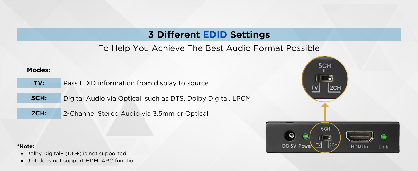 ✅ Supports 3 different EDID settings to help achieve best audio format possible for the desired output