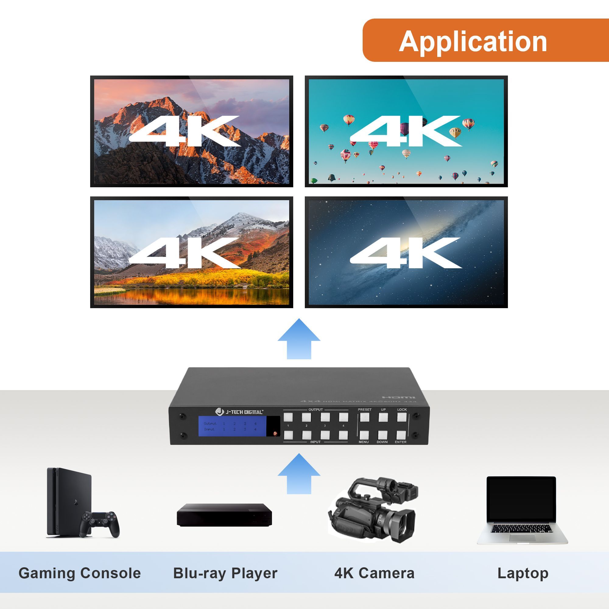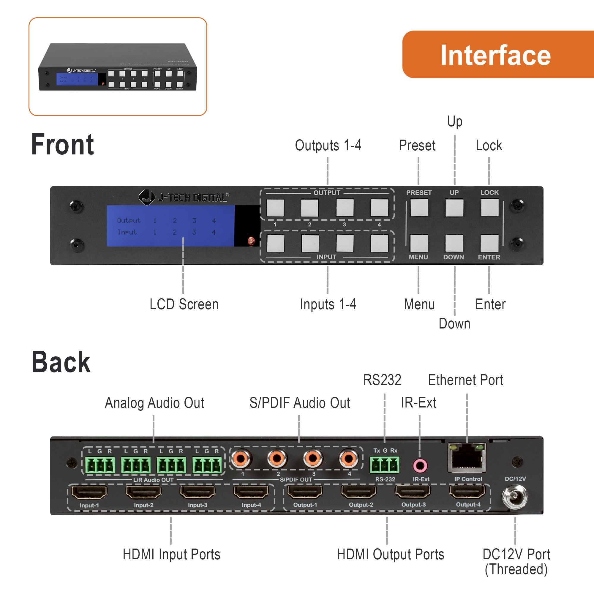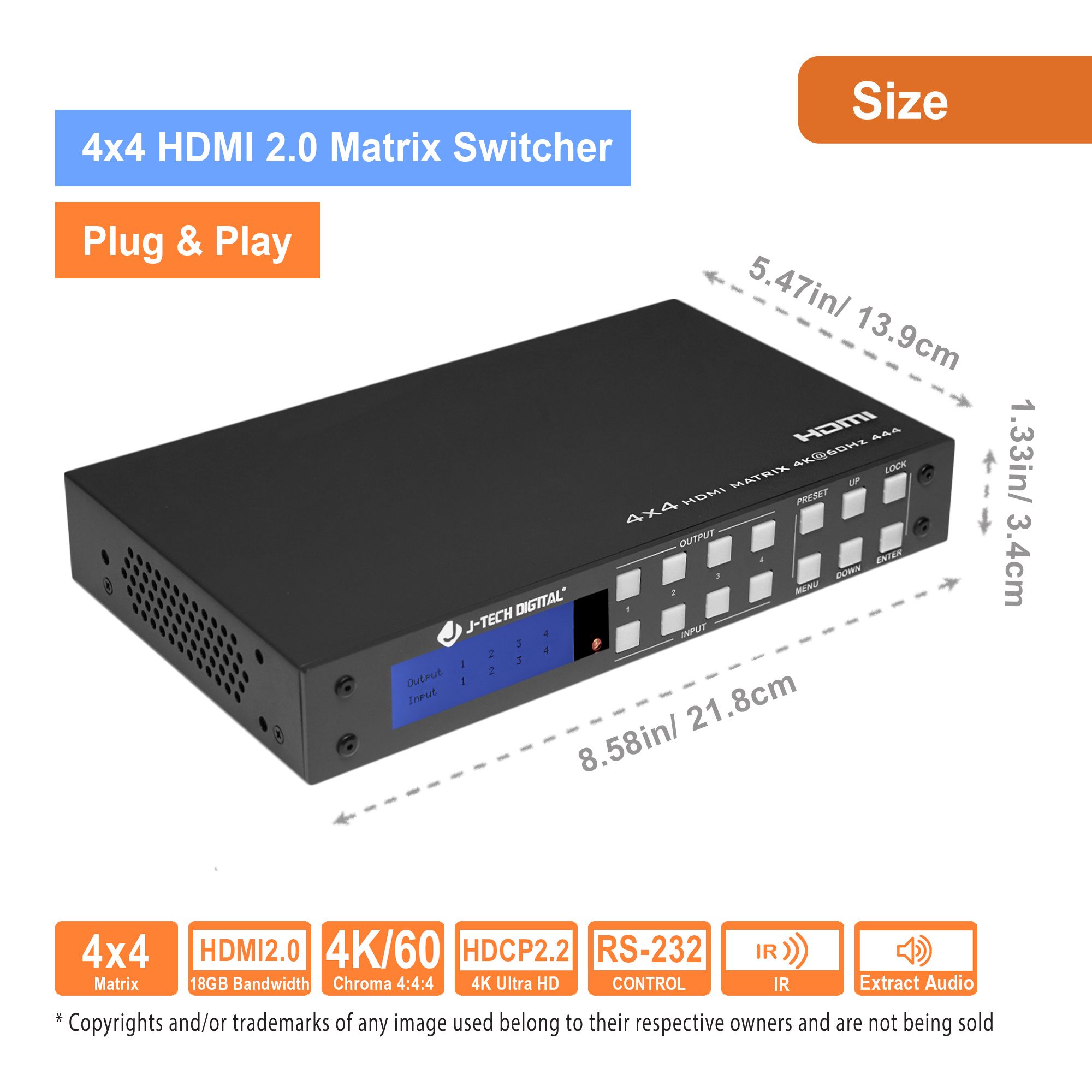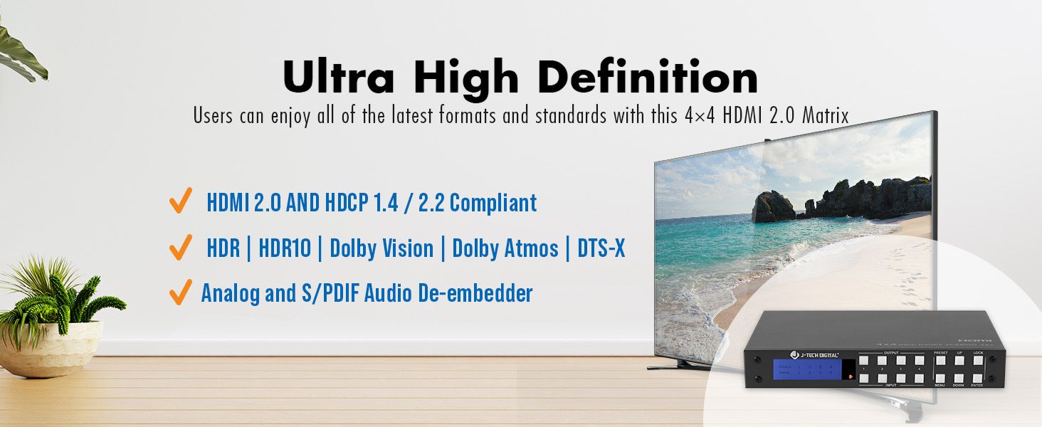 The J-Tech Digital JTECH-4KM44A is a professional UHD 4K@60Hz 4:4:4 HDR HDMI video distribution matrix switcher. With 18Gbps HDMI 2.0 support, the JTECH-M4KM44A 4×4 HDMI Matrix allows up to four UHD 4K sources to be independently routed to four UHD displays. All four outputs support audio de-embedding via coaxial S/PDIF or analog phoenix connectors. Pair the audio de-embedding function with the JTECH-4KM44A‘s EDID management tool (built in EDID + EDID copy) and you have an incredibly versatile and flexible HDMI routing system suitable for a number of applications.