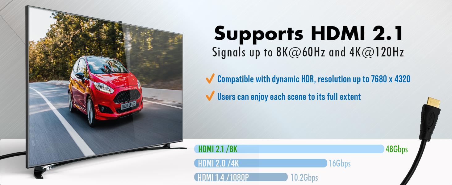 • ✅ 4K@120Hz | 8K@60Hz Capable: The JTECH-8KCAB1 HDMI 2.1 cable supports HDMI 2.1 signals up to 8K@60Hz and 4K@120Hz, with up to 48Gbps bandwidth. Supports dynamic HDR and 12-bit color information. Enjoy your favorite content to its full extent.