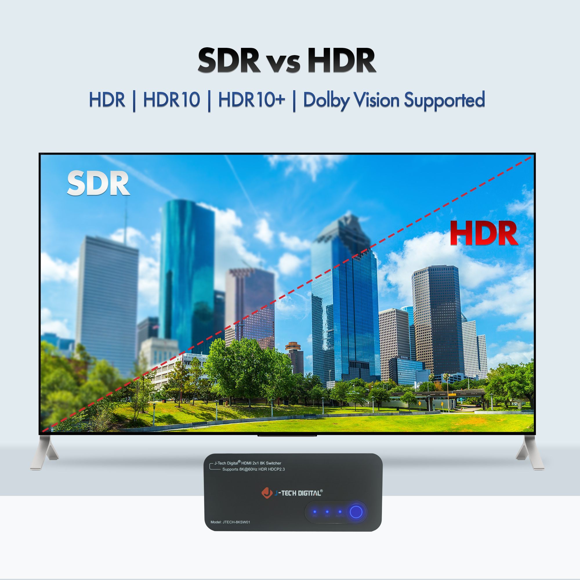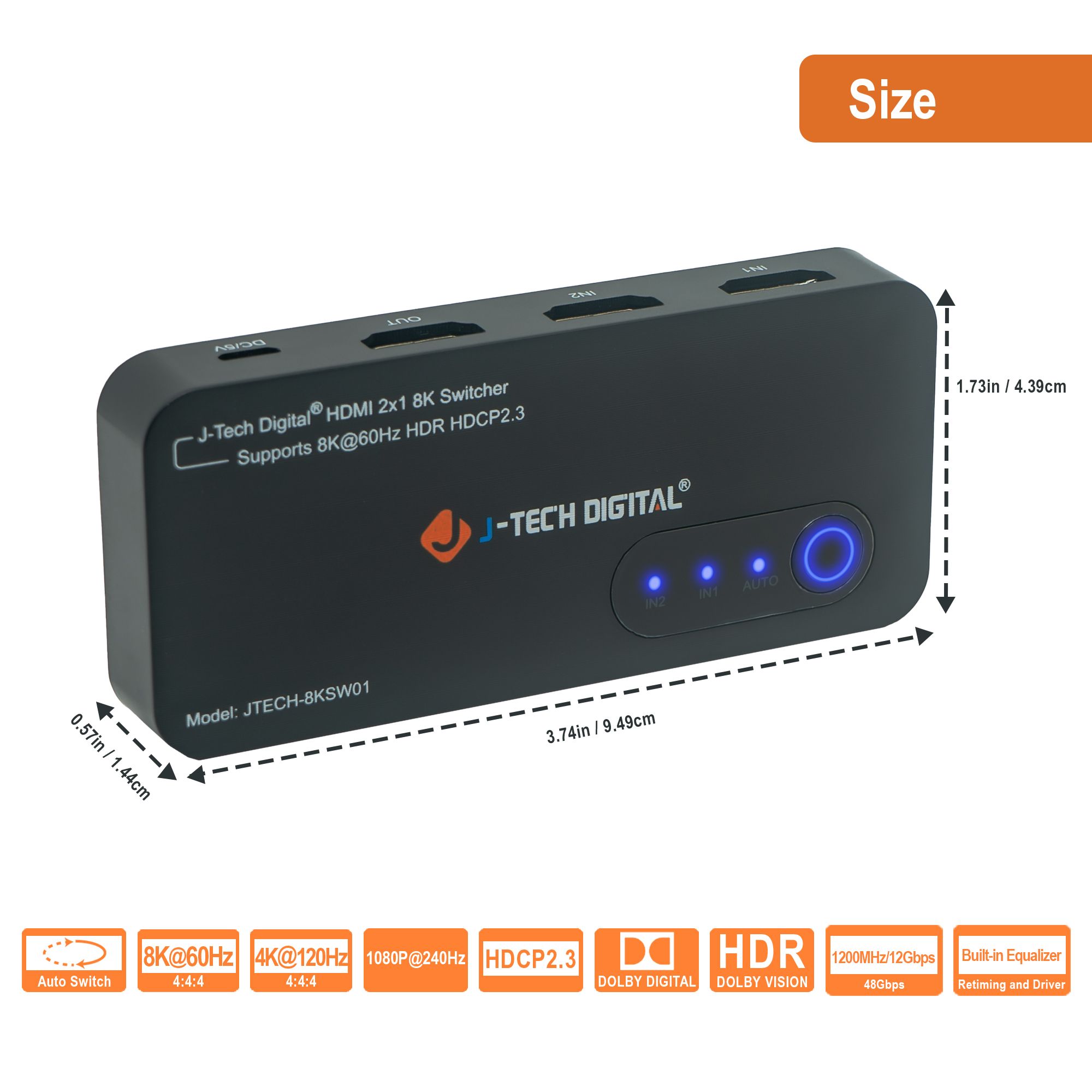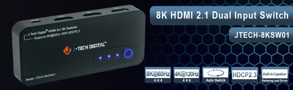 The J-Tech Digital JTECH-8KSW01 8K HDMI 2.1 dual input switch is the perfect addition to any new 8K TV or display! Connect two 8K source devices, like a PC or next gen gaming console (Playstation 5 / Xbox Series X) to the JTECH-8KSW01 and have instant access to either source device! Make sure you’re getting the full gaming experience with supported HDMI 2.1 features like ALLM (auto low-latency mode), VRR (variable refresh rate) and QFT (quick frame transport). Stay ahead of the competition with full 4K @ 120Hz resolution and refresh rate support. Enjoy 8K 60Hz content with full High Dynamic Range (HDR) supported – HDR | HDR10+ | Dolby Vision.