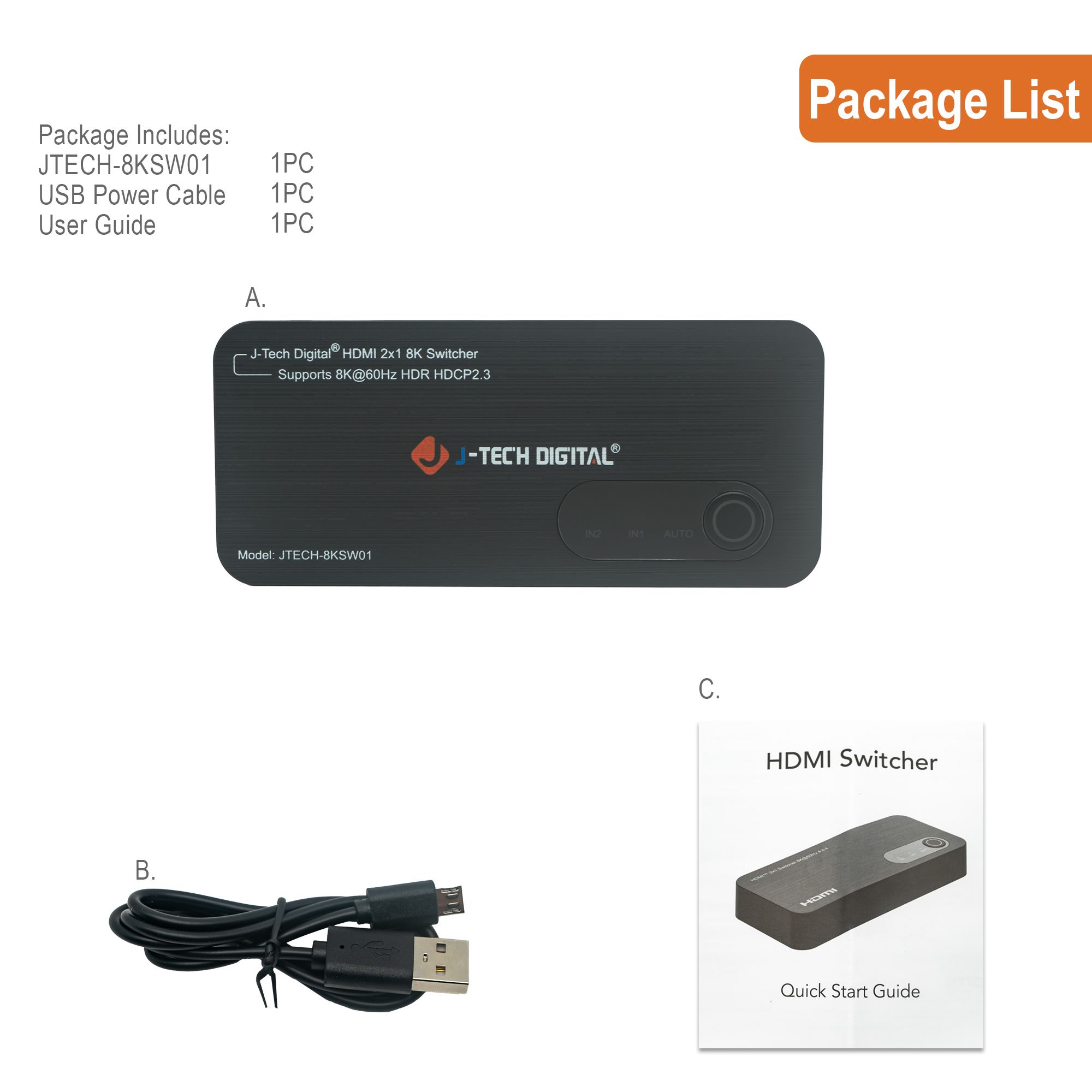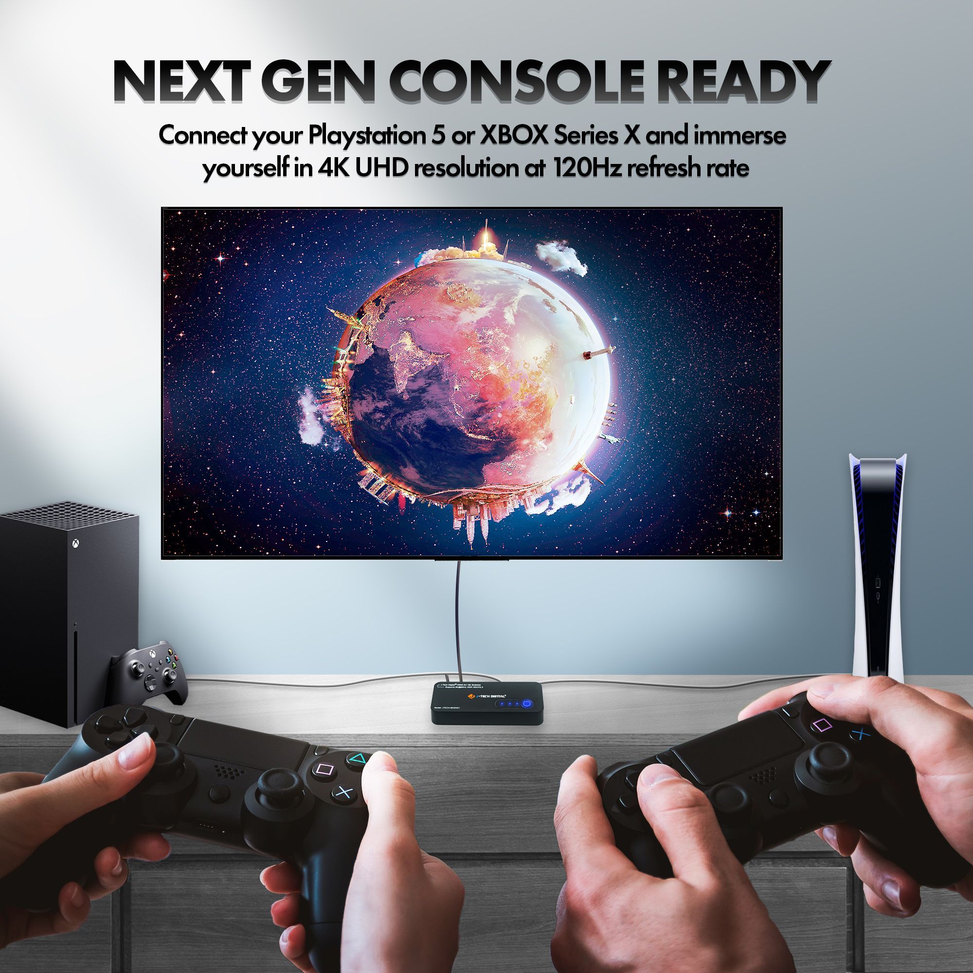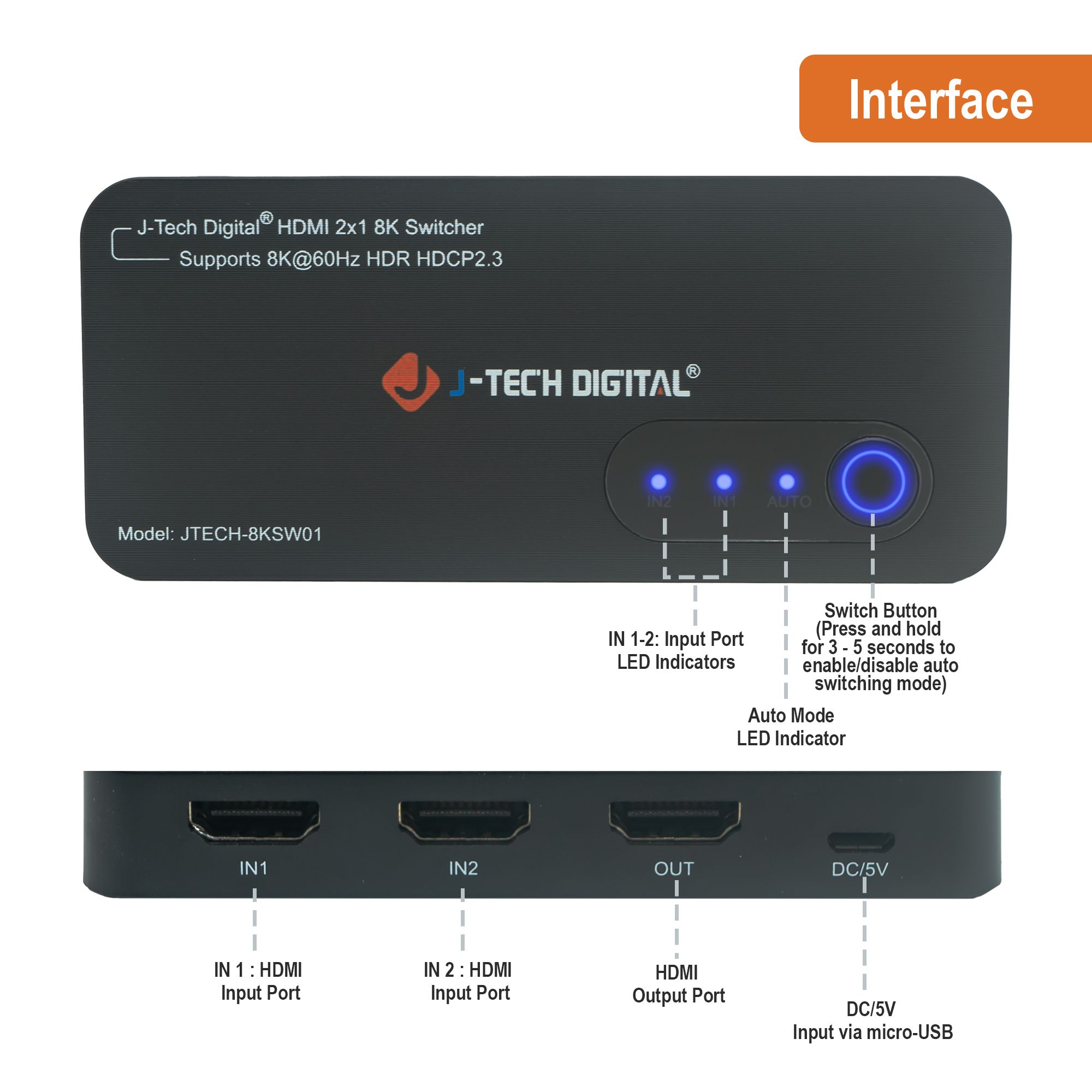 The J-Tech Digital JTECH-8KSW01 8K HDMI 2.1 dual input switch is the perfect addition to any new 8K TV or display! Connect two 8K source devices, like a PC or next gen gaming console (Playstation 5 / Xbox Series X) to the JTECH-8KSW01 and have instant access to either source device! Make sure you’re getting the full gaming experience with supported HDMI 2.1 features like ALLM (auto low-latency mode), VRR (variable refresh rate) and QFT (quick frame transport). Stay ahead of the competition with full 4K @ 120Hz resolution and refresh rate support. Enjoy 8K 60Hz content with full High Dynamic Range (HDR) supported – HDR | HDR10+ | Dolby Vision.