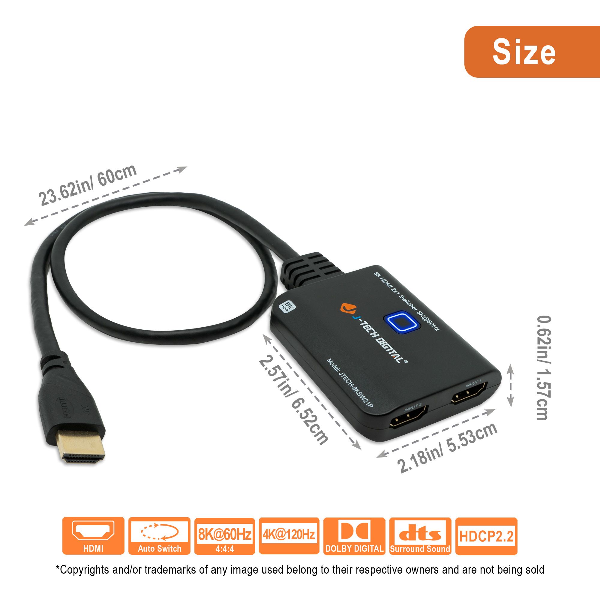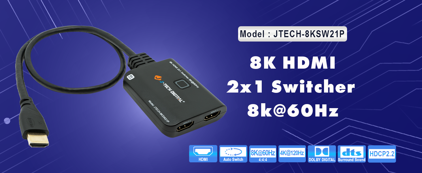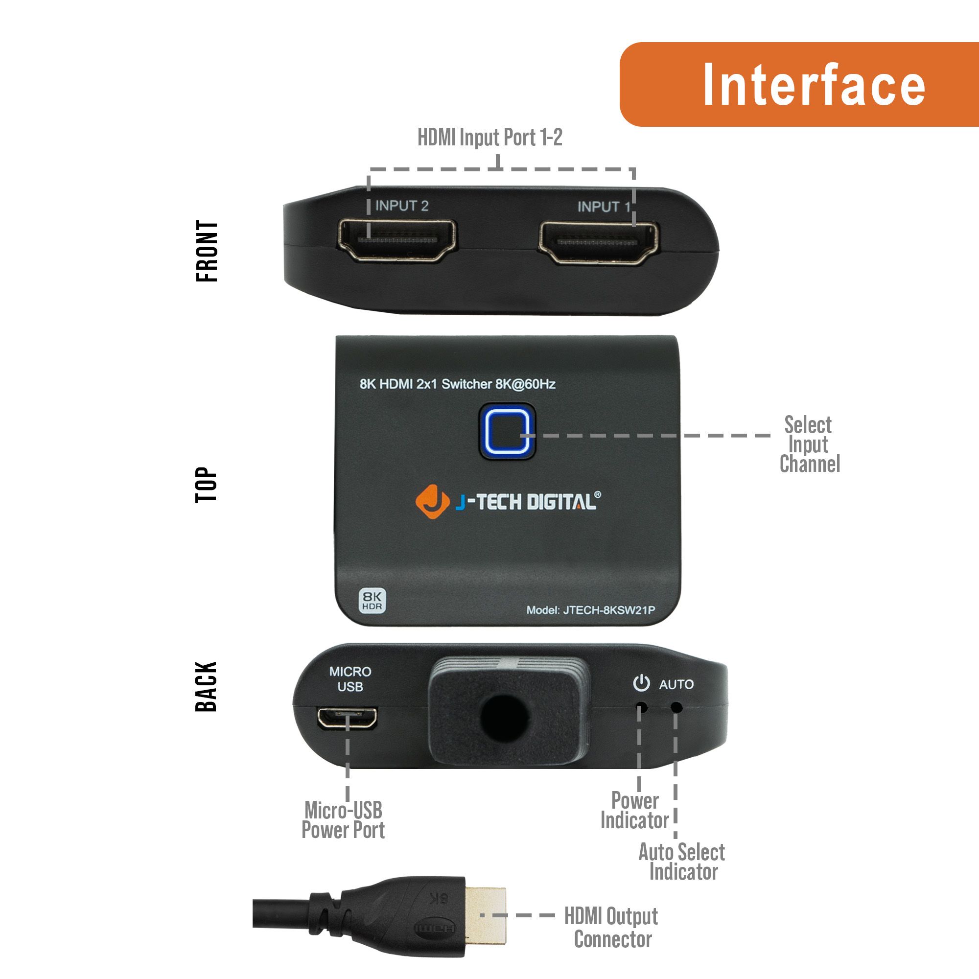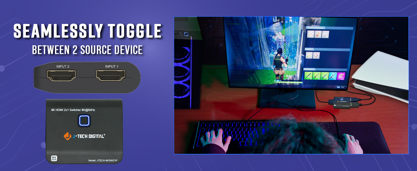 • ✅ 2x1 HDMI Switch: Featuring dual HDMI 2.1 input ports and 1 x HDMI output port, the JTECH-8KSW21P 8K switcher is perfect for connecting two source devices, such as an XBOX and PS5, to 1 display. Auto Switching feature makes it easy to toggle between the source devices.