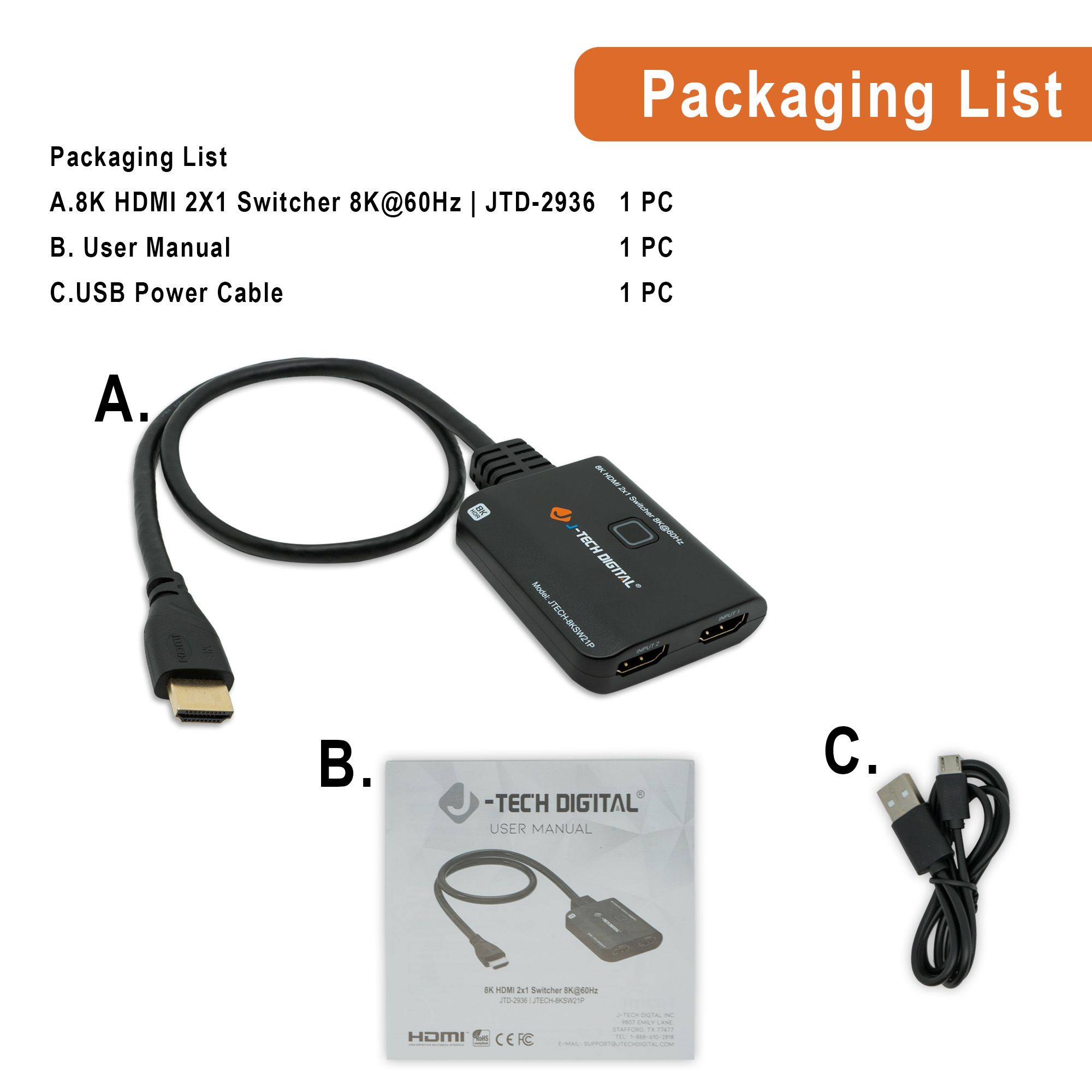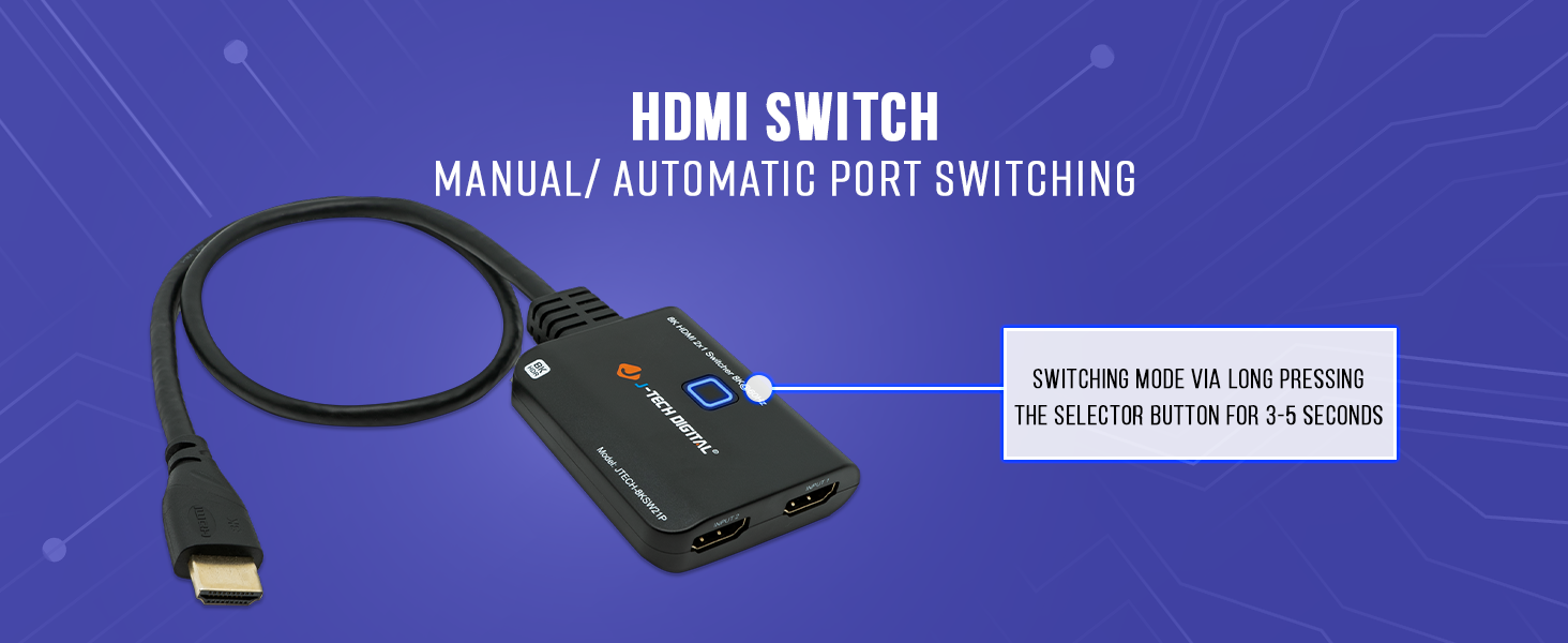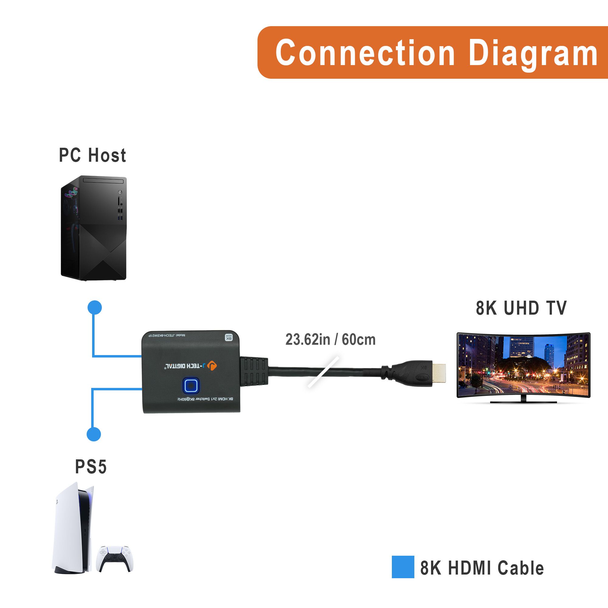 • ✅ 2x1 HDMI Switch: Featuring dual HDMI 2.1 input ports and 1 x HDMI output port, the JTECH-8KSW21P 8K switcher is perfect for connecting two source devices, such as an XBOX and PS5, to 1 display. Auto Switching feature makes it easy to toggle between the source devices.