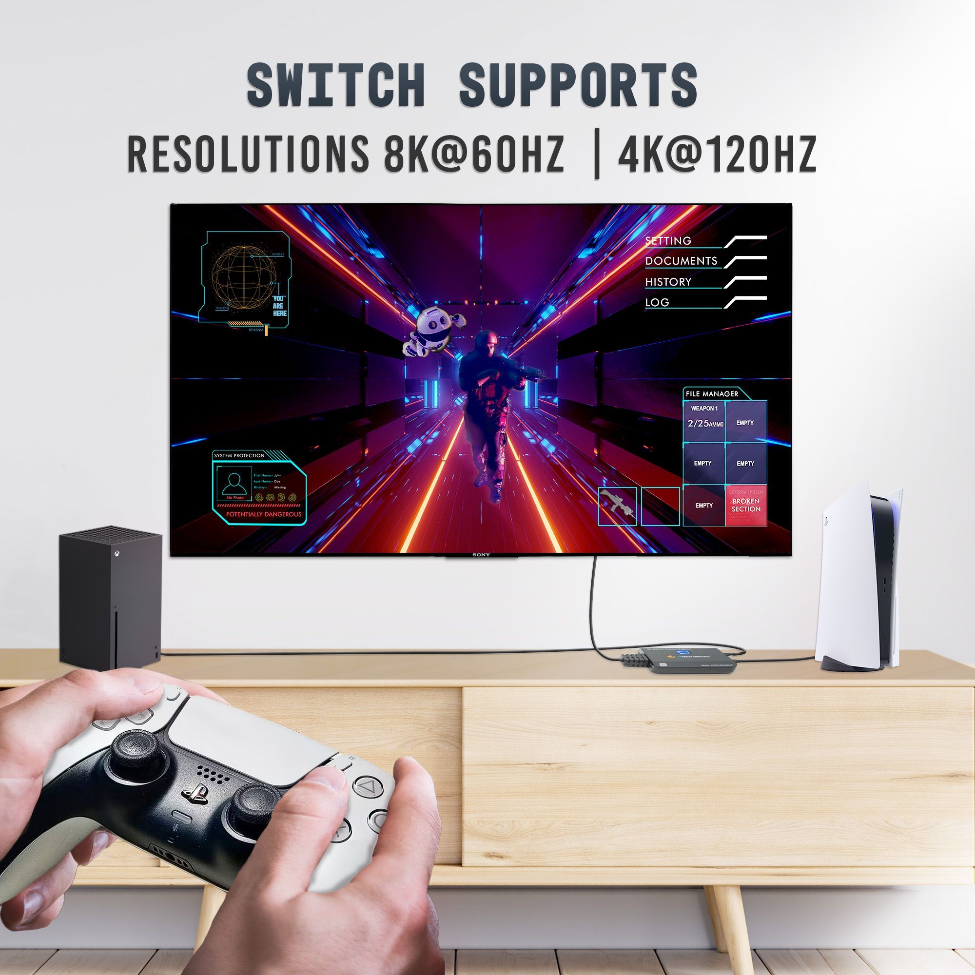 2x1 HDMI Switch – Connect Xbox and PS5 to a single display, supports 8K@60Hz, 4K@120Hz, HDR, Dolby Vision, and auto-switching for seamless gaming