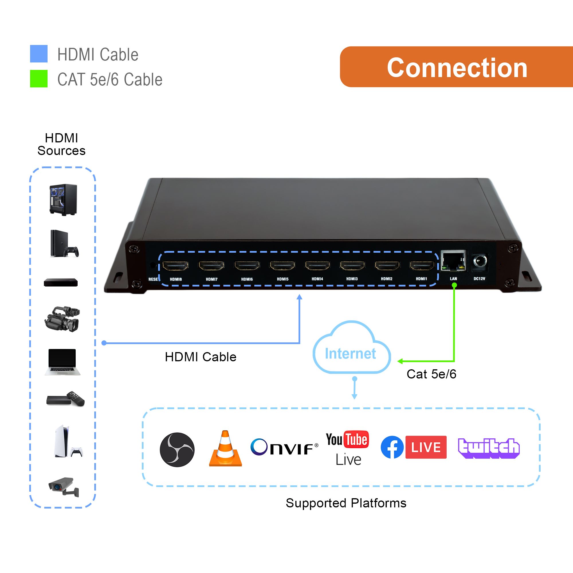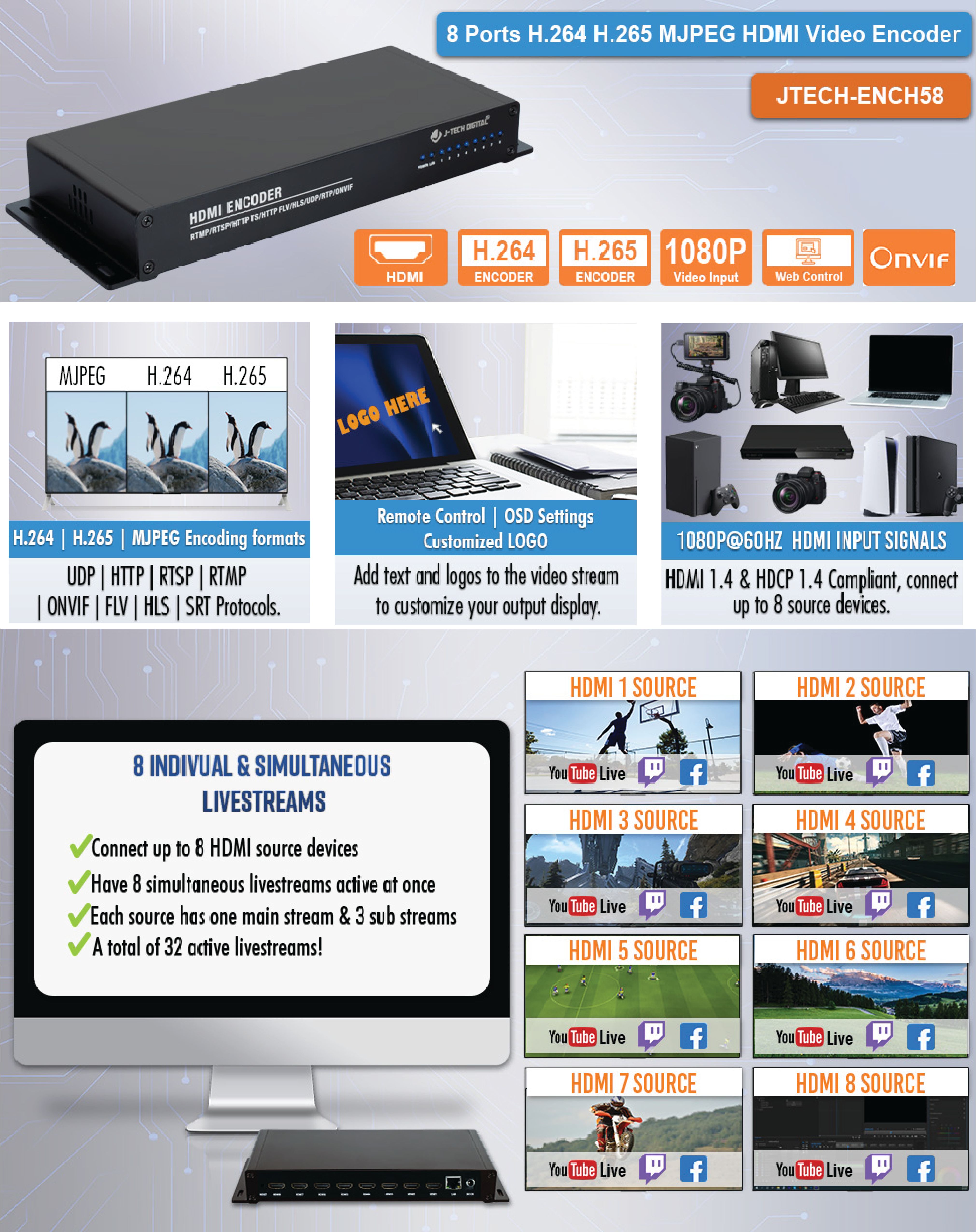 The J-Tech Digital JTECH-ENCH58 8 input HDMI H.264 H.265 MJPEG Livestream encoder is an IPTV live streaming device offered by J-Tech Digital used to get your event or content online. Broadcast up to eight 1080P 60Hz HDMI input signals to multiple streaming platforms like YouTube Live, Facebook Live and Twitch simultaneously. This J-Tech Digital 1080P H.265 / H.265 / MJPEG IPTV encoder supports multiple protocols (UDP | HTTP | RTSP | RTMP | FLV | ONVIF) so that you can share your message, no matter the needed format. Broadcast your message beyond your walls and establish your online presence today.
