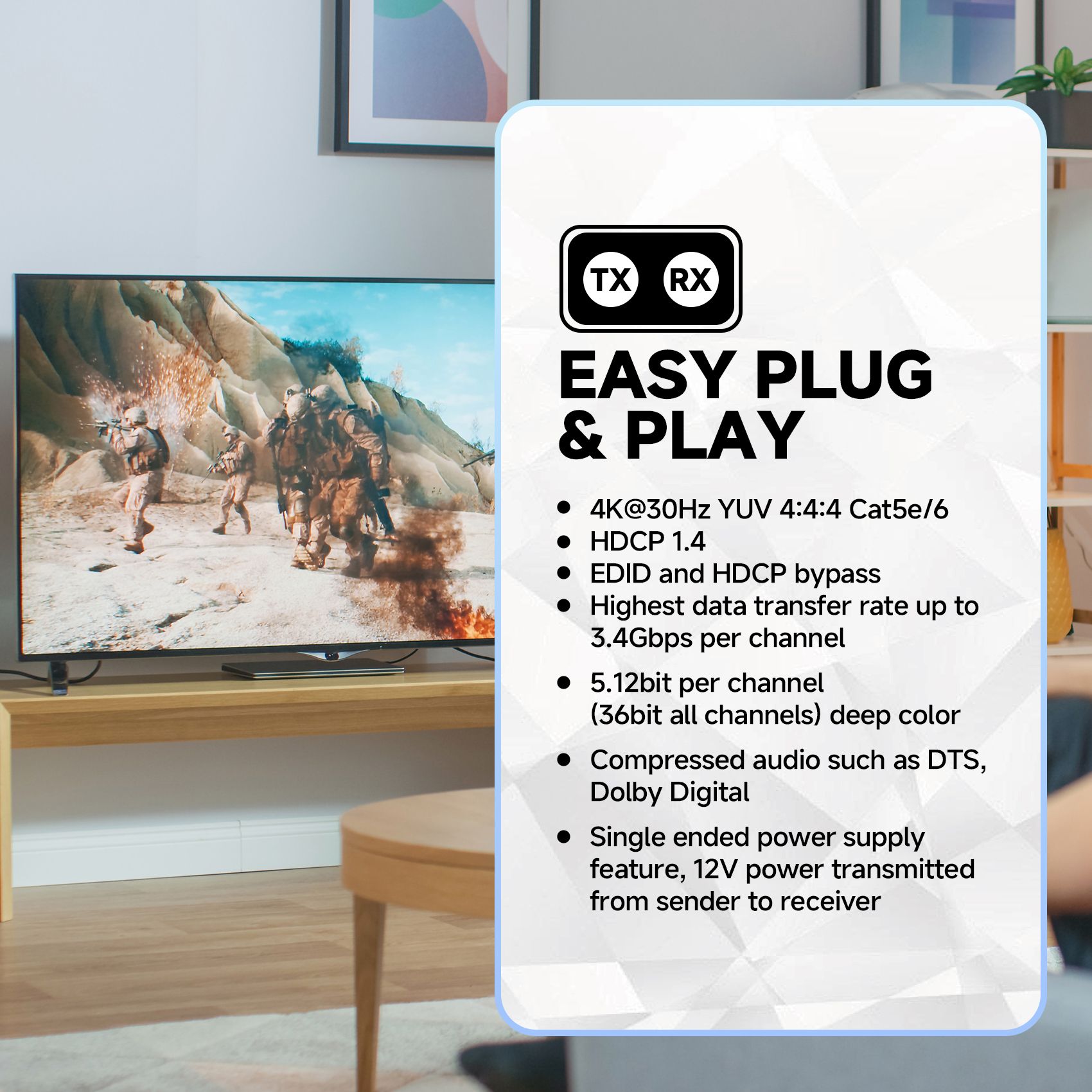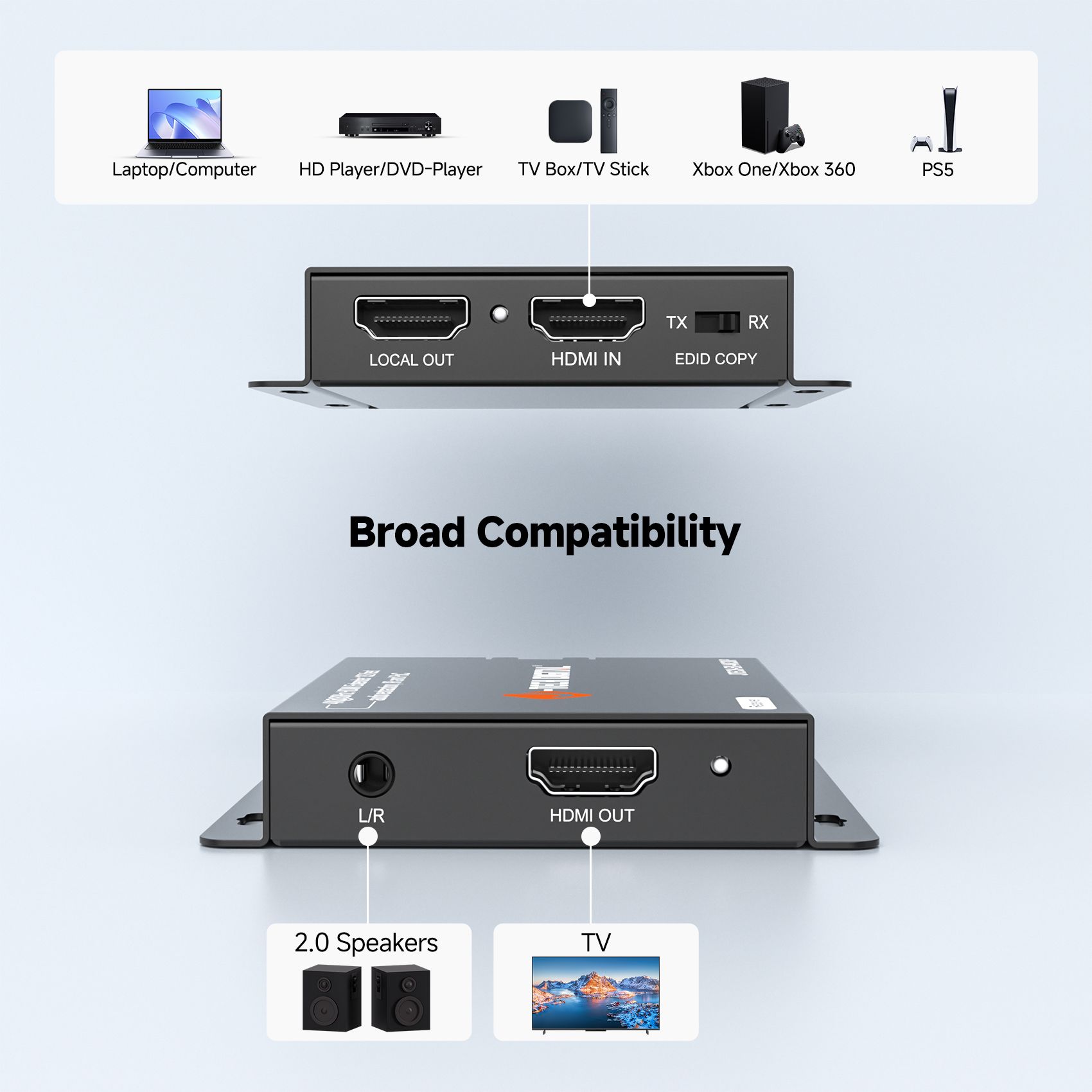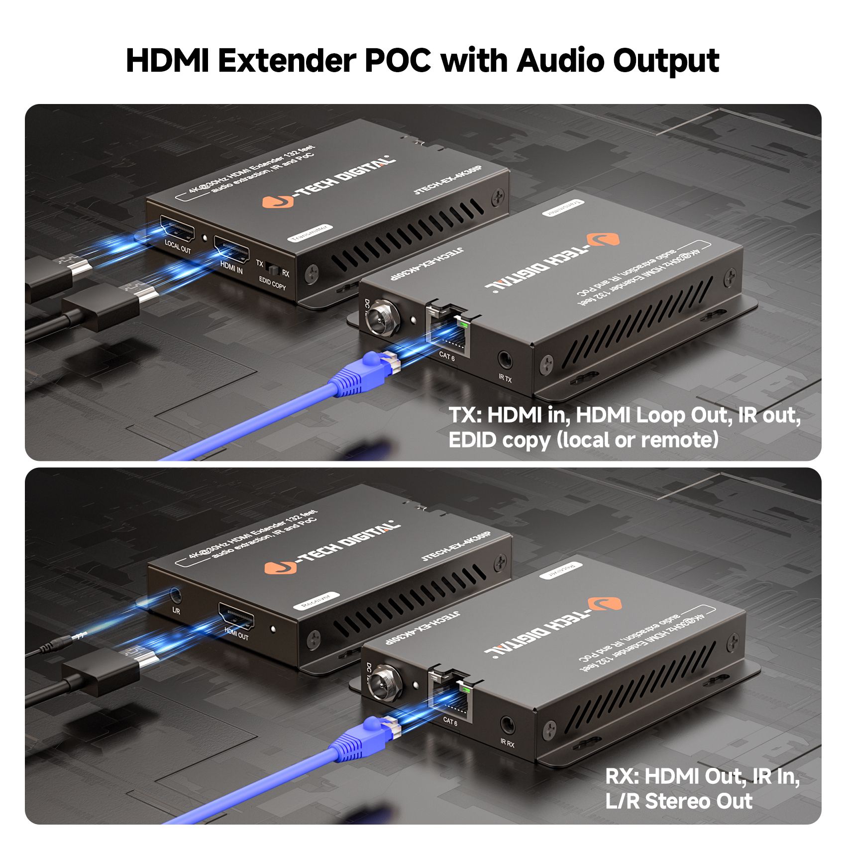 Easily extend your HDMI signal over long distances with this 4K HDMI Extender over Ethernet. Transmit stunning 4K@30Hz video up to 132 feet and 1080P Full HD up to 230 feet using a single CAT6/7 cable — no signal loss, no lag. Featuring convenient Power over Cable (PoC) technology, this extender requires just one power adapter for both transmitter and receiver. Ideal for home theaters, conference rooms, digital signage, classrooms, and more. Includes local HDMI loop out for on-site display monitoring and a 3.5mm audio out for external audio system integration. Features an EDID toggle switch on the transmitter to help with compatibility issues between the connected input HDMI source device and the display.