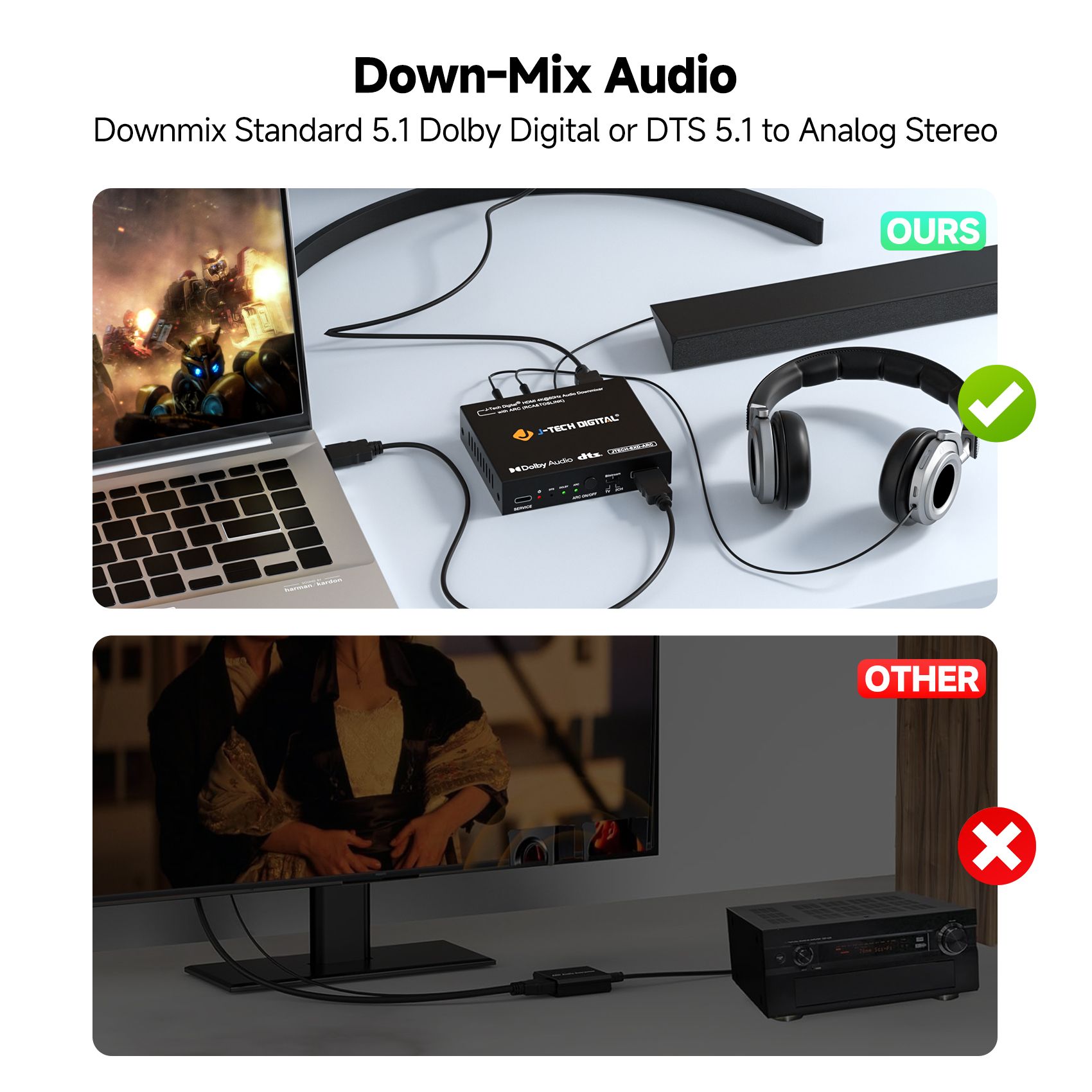 ✅ Audio downmixing; allows you to convert standard 5.1 audio to stereo ch. audio to pass via L/R output