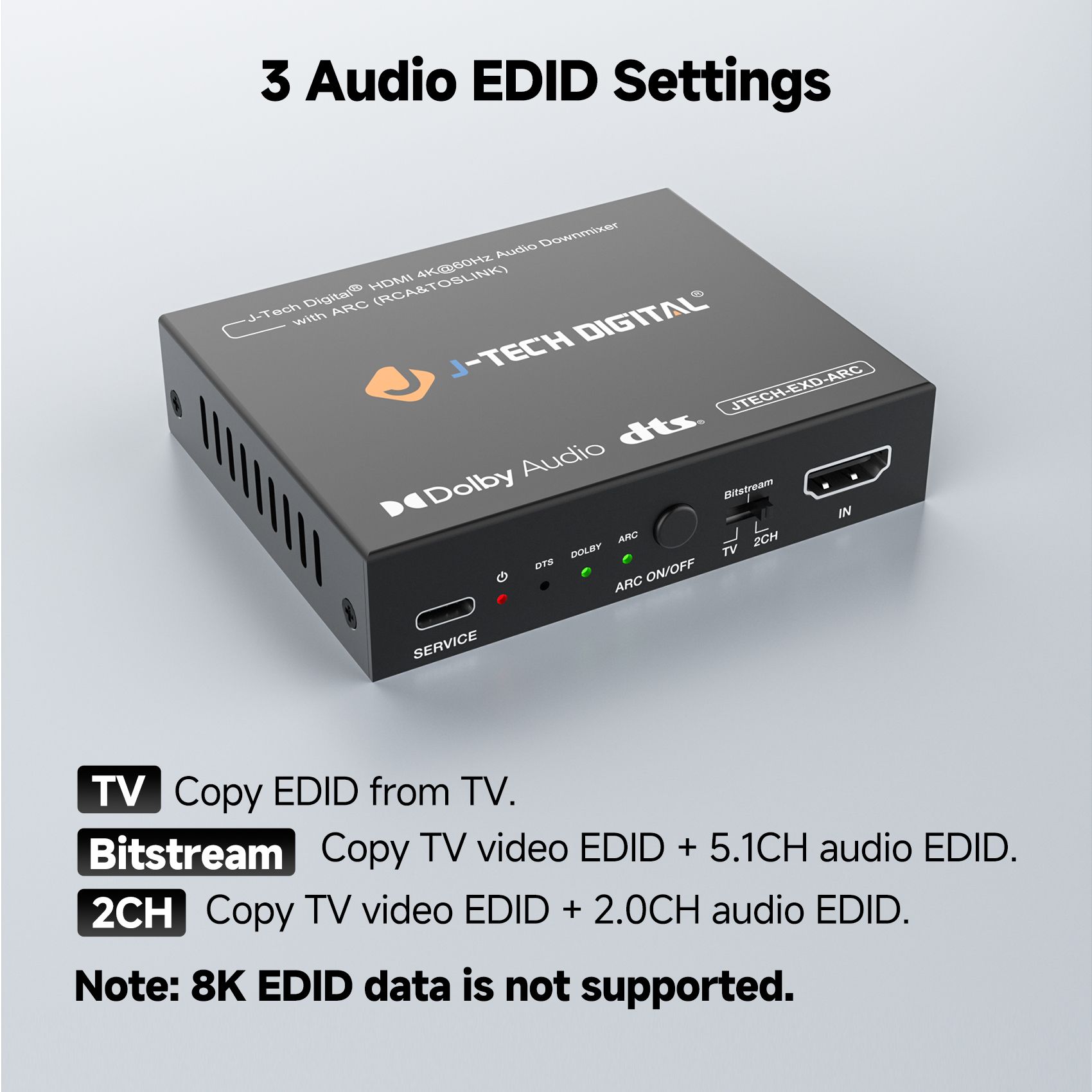 For enhanced audio flexibility, this extractor features 5.1 audio downmixing, converting Dolby Digital/DTS 5.1 surround sound into stereo audio for older speakers. The built-in EDID switch (TV, 2CH, 5CH modes) ensures seamless compatibility between your source device and display, eliminating audio/video issues.