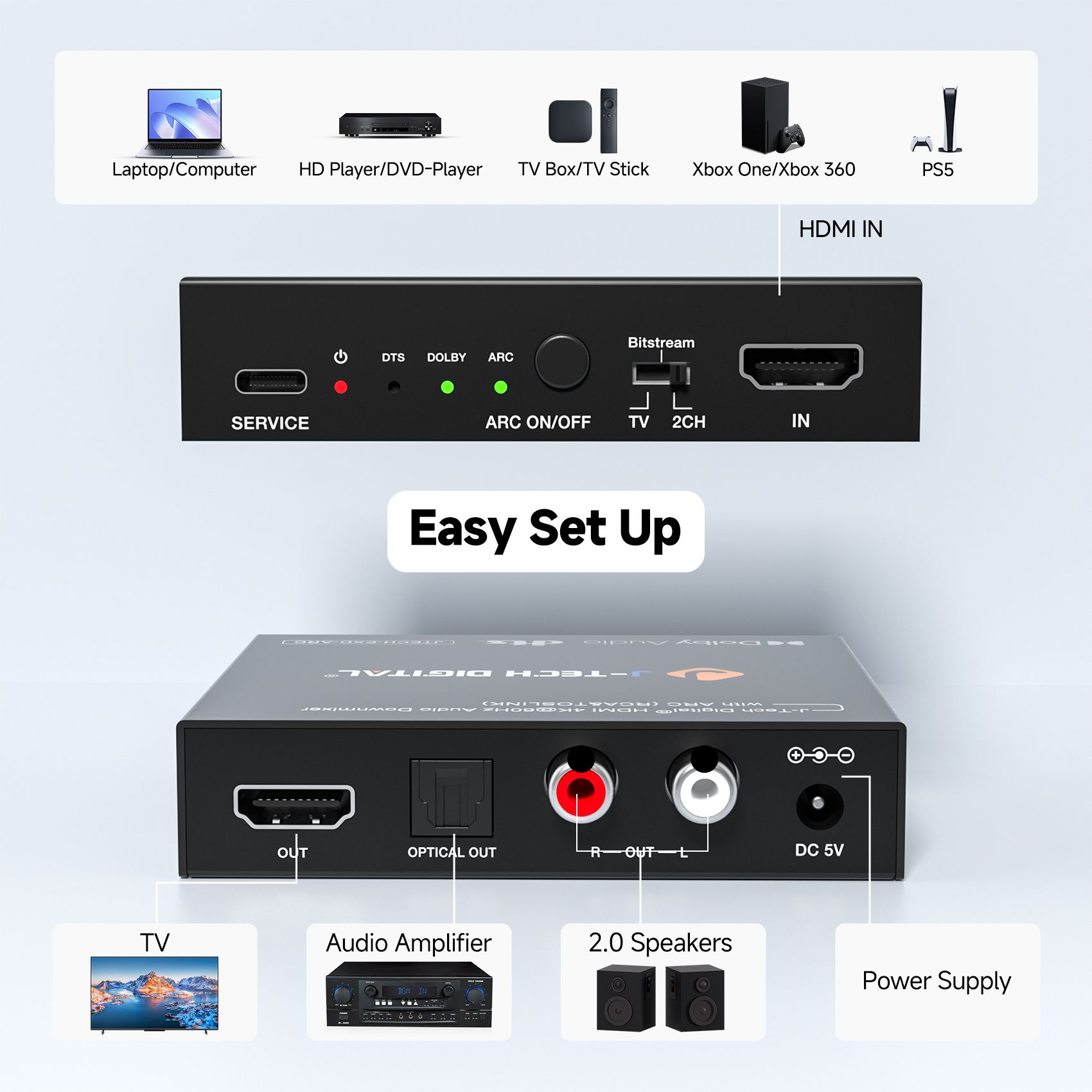 Enjoy crystal-clear 4K@60Hz UHD video with HDR support, fully compatible with HDCP 2.2/1.x devices, making it ideal for TVs, projectors, and monitors. The HDMI ARC function allows you to extract TV audio and send it to an external sound system via optical and L/R output (Note: eARC not supported)