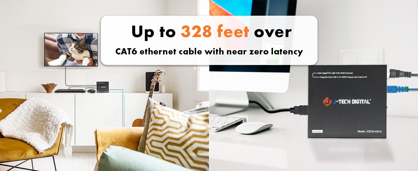 The J-Tech Digital JTECH-KVE2 HDMI & USB 2.0 KVM extender allows users to extend USB keyboard, mouse and HDMI signals up to 328 feet over CAT6 ethernet cable with near zero latency. This allows users to control a computer (or USB device) remotely up to 300+ feet away. Connect two remote HDMI displays to the receiver’s dual HDMI output ports and one local HDMI display to the transmitter’s local loop HDMI output port for flexible monitoring options. Extract source audio via the 3.5mm analog audio output ports found on both the transmitter and receiver so that users can route audio to a 3rd party audio processor/amplifier.
