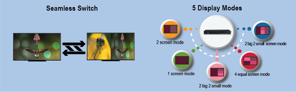 ✅5 Different Display Modes: This switch offers multiple ways to watch your source devices, allowing you to display 1 device, 2 devices, or all 4 devices at the same
