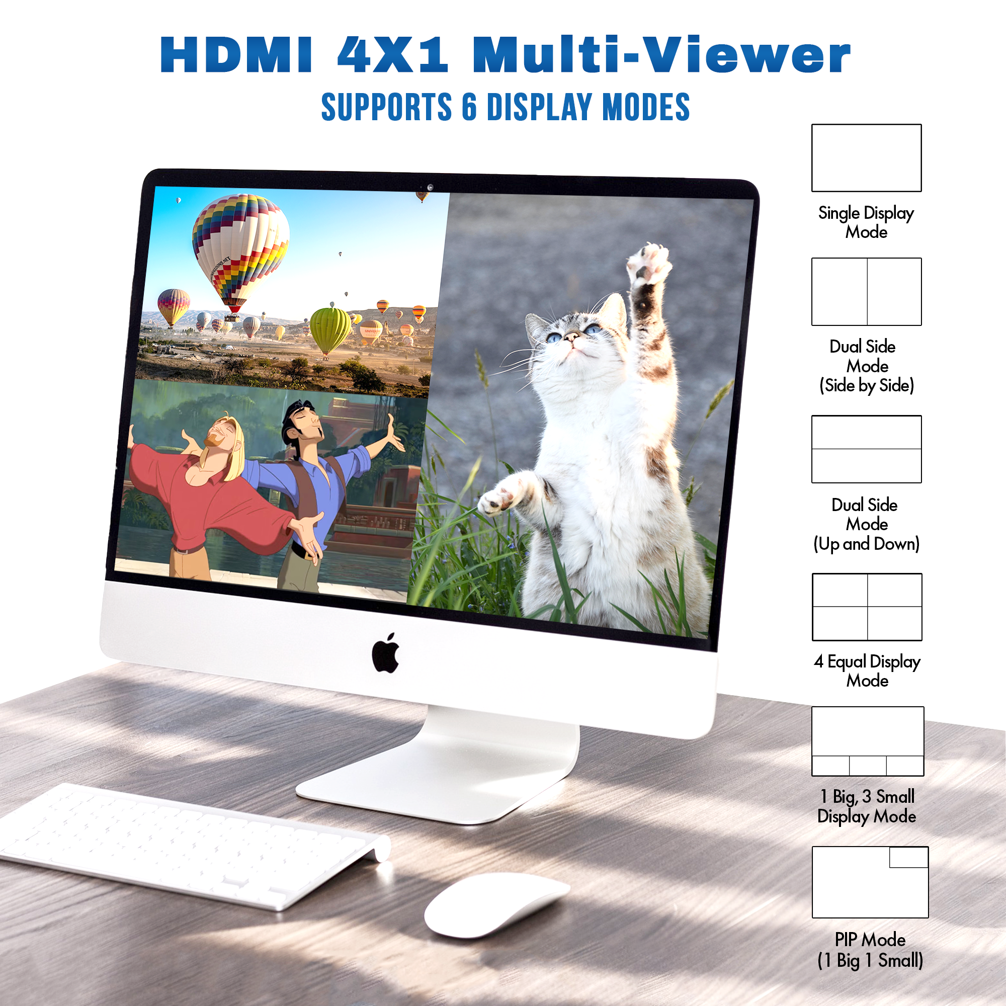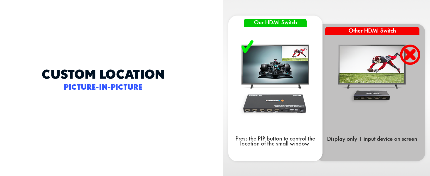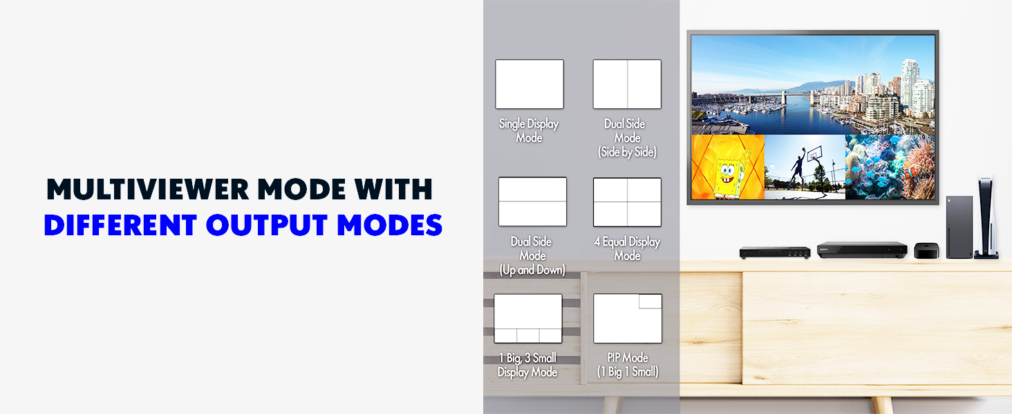 • ✅ 6 Different Viewing Modes with PiP Function: View all connected source devices on a single display using the HDMI quad multiviewer’s built-in 6 viewing modes. Also features a customizable Picture-in-Picture (PiP) function.