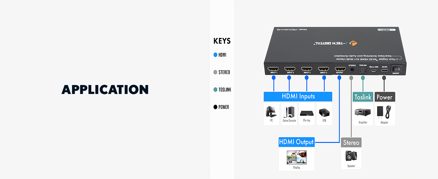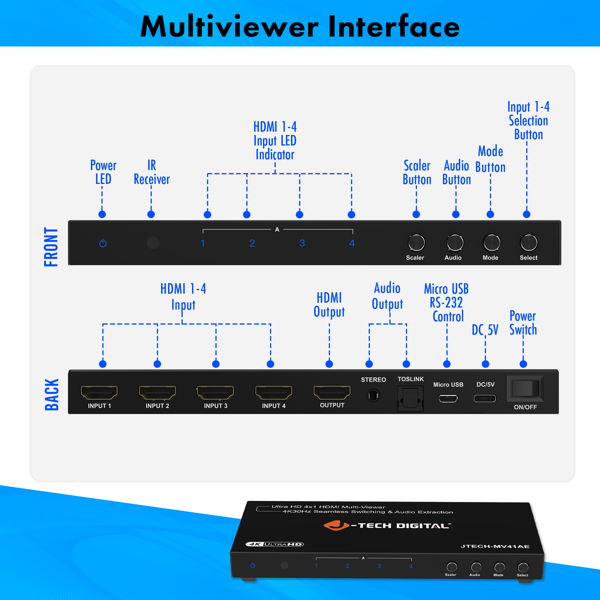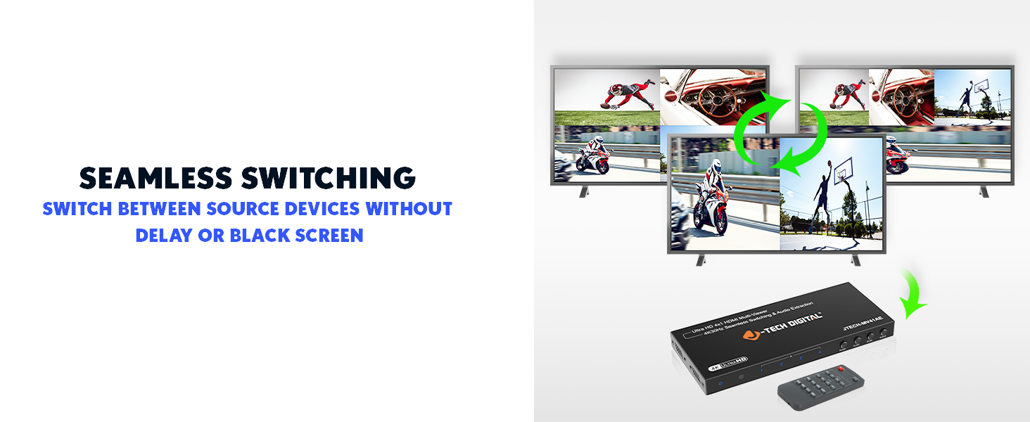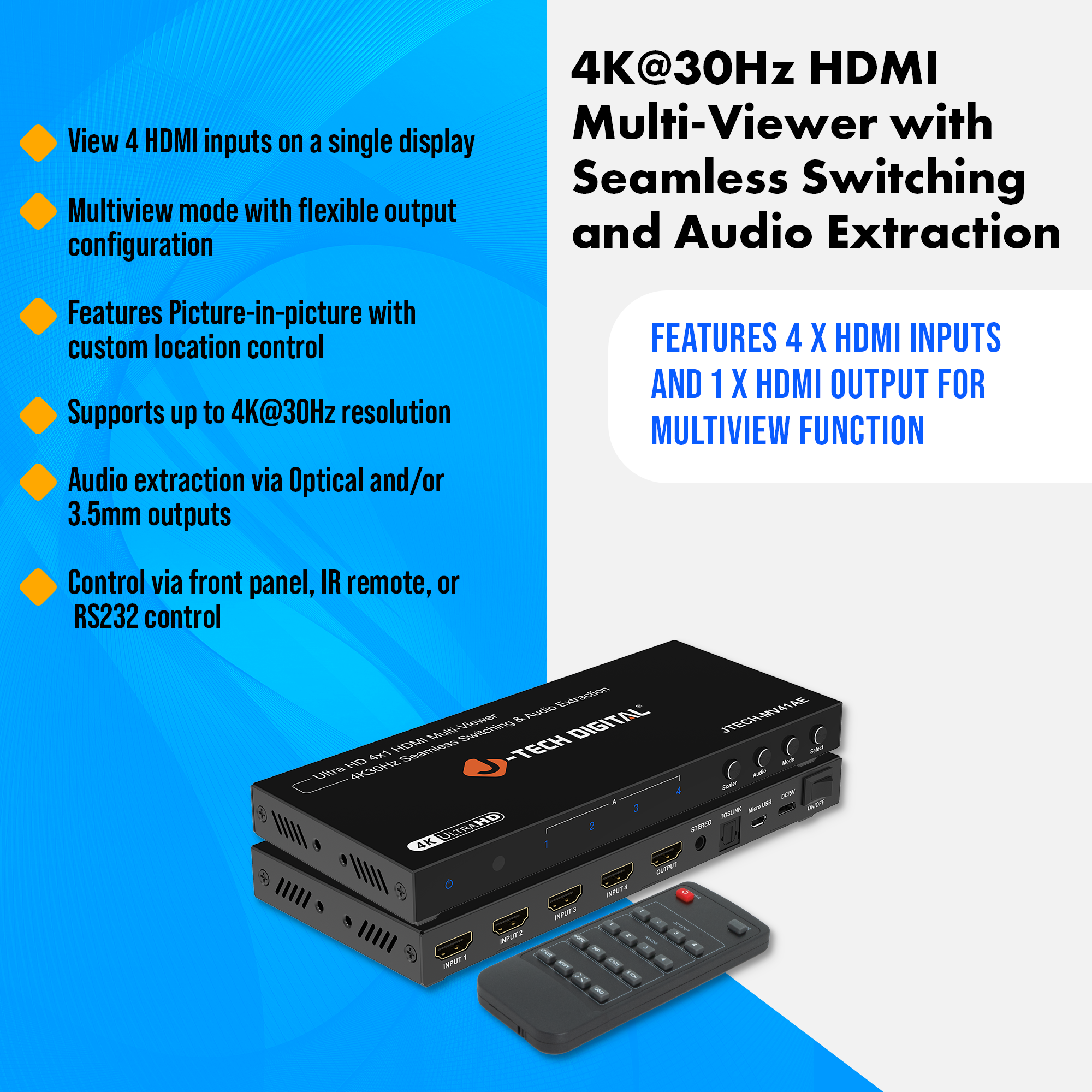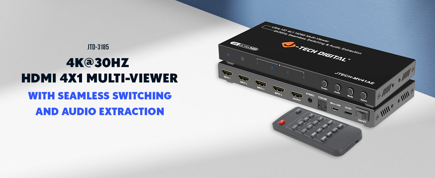 Introducing the JTECH-MV41AE 4x1 4K@30Hz HDMI multiviewer and seamless switcher. With 4 In and 1 Out HDMI ports, this HDMI quad multiviewer allows you to view up to four HDMI sources on a single display with seamless switching between devices, eliminating delays or black screens. Supporting resolutions up to 4K@30Hz, it is compatible with gaming consoles, security systems, and media players. With six viewing modes and a customizable Picture-in-Picture (PiP) function, it offers versatile display options. Additionally, it features audio extraction via optical and 3.5mm outputs for external sound systems and provides convenient control through included remote control, front panel buttons, and RS232 control.