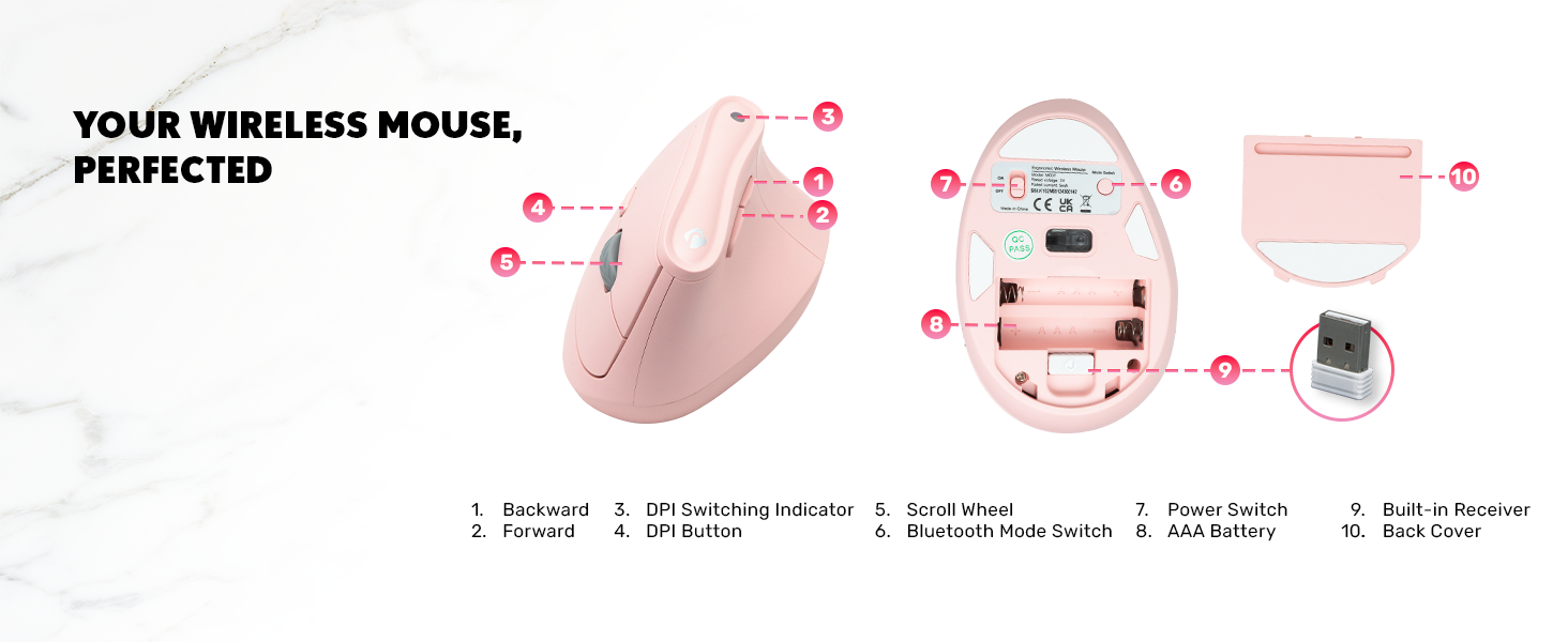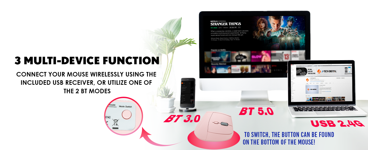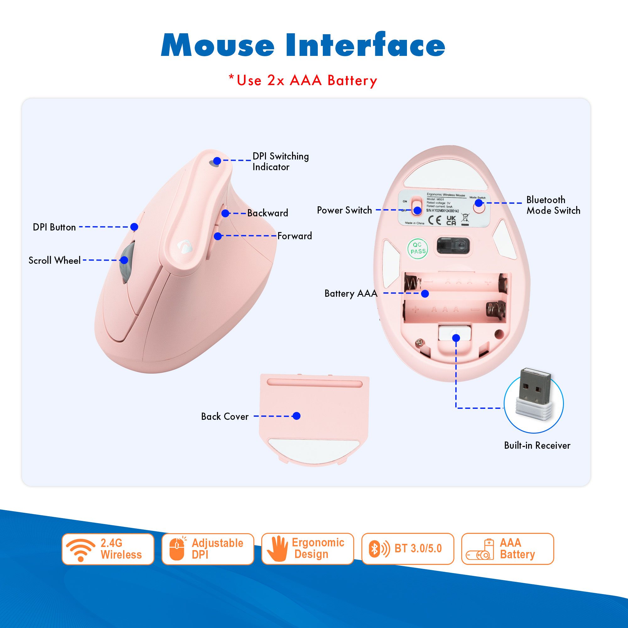 Say goodbye to arm and wrist strain caused by using a traditional mouse! The J-Tech Digital Wireless Vertical Ergonomic Mouse features a design that places your hand in a natural “handshake” position which greatly reduces strain on your wrist and arm especially during extended computer sessions. This wireless mouse features 2.4G wireless and 3.0 / 5.0 Bluetooth modes to allows for 3 multi-device connectivity. Made for small-medium sized hands and right-hand orientation, it’s never too late to start taking advantage of all the benefits that this wireless mouse has to offer!