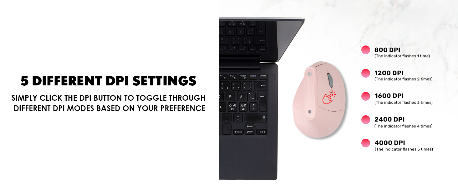 ✅ 5 adjustable DPI modes; 800 / 1200 / 1600 / 2400 / 4000. Compatible with Windows and Mac OS