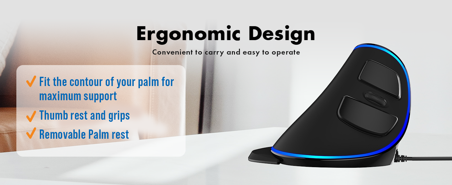Wired Vertical Ergonomic Mouse with Removable Palm Rest and Adjustable DPI, Blue LED Trim (Black)