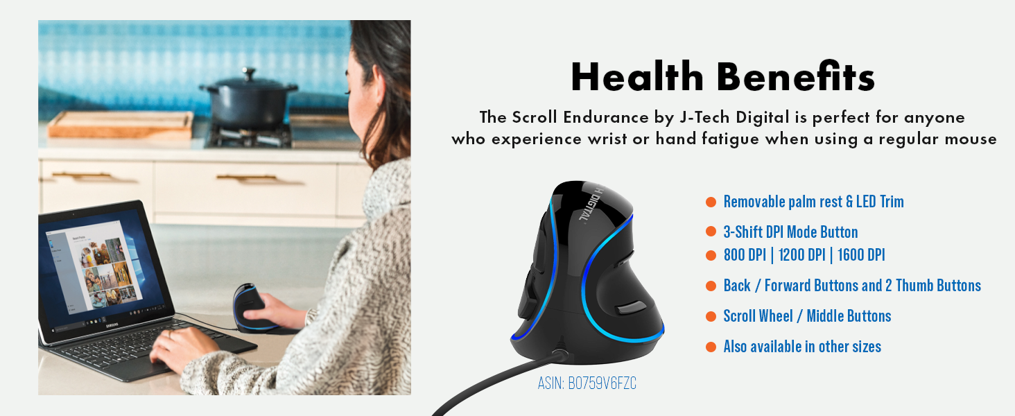 Say goodbye to wrist and hand strain with the J-Tech Digital Scroll Endurance Mouse, specially designed for users who experience discomfort from traditional mice. Its vertical ergonomic design naturally positions your hand to reduce forearm and wrist torsion, helping prevent repetitive stress injuries.